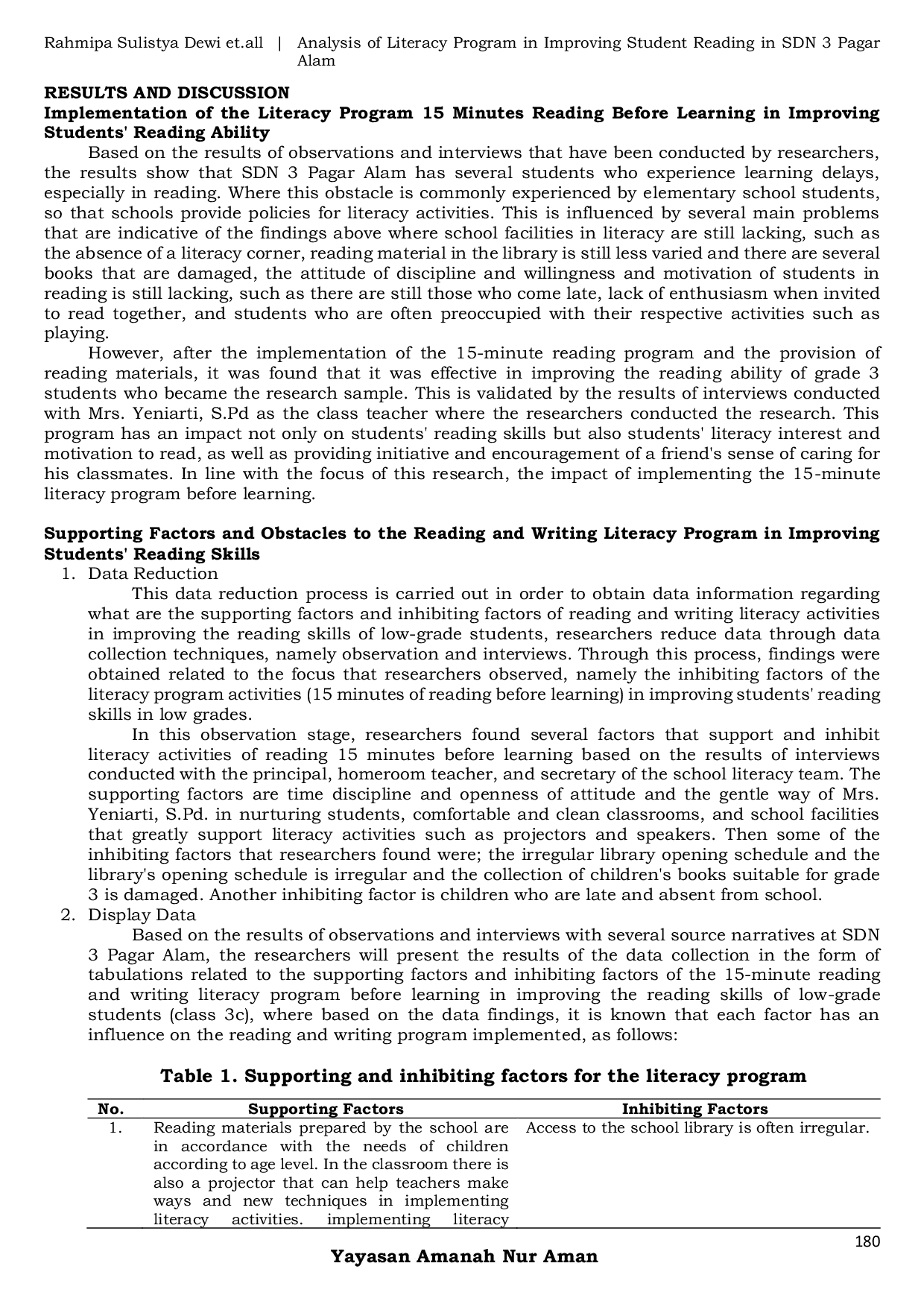 Program literasi 15 menit membaca sebelum pembelajaran terbukti efektif meningkatkan kemampuan membaca dan minat baca siswa kelas rendah di SD Negeri 3 Pagar Alam.Faktor pendukung keberhasilan program ini meliputi peran aktif guru, ketersediaan fasilitas seperti proyektor dan ruang perpustakaan, serta ketersediaan bacaan yang sesuai usia.Di sisi lain, program ini dihadapkan pada kendala seperti jadwal perpustakaan yang tidak teratur, kerusakan buku, variabilitas karakter siswa, dan kurangnya pelatihan guru.
