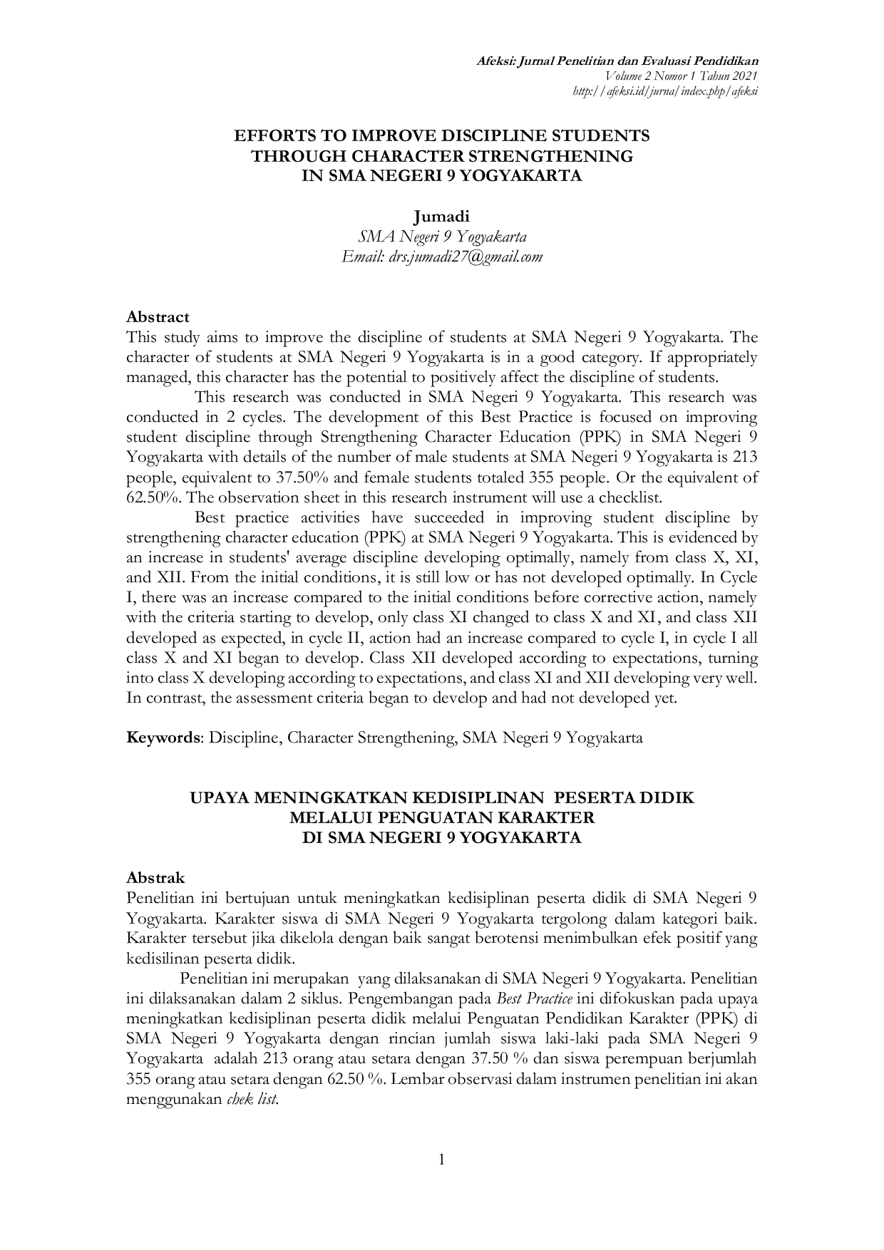 Afeksi: Jurnal Penelitian dan Evaluasi PendidikanAfeksi: Jurnal Penelitian dan Evaluasi PendidikanPenelitian ini bertujuan untuk meningkatkan kedisiplinan peserta didik di SMA Negeri 9 Yogyakarta. Karakter siswa di SMA Negeri 9 Yogyakarta tergolong dalam kategori baik. Karakter tersebut jika dikelola dengan baik sangat berpotensi menimbulkan efek positif terhadap kedisiplinan peserta didik. Penelitian ini dilakukan dalam 2 siklus dengan fokus pada penguatan pendidikan karakter (PPK). Hasil menunjukkan peningkatan kedisiplinan peserta didik dari kondisi awal hingga siklus II, terutama pada kelas X, XI, dan XII yang berkembang optimal.