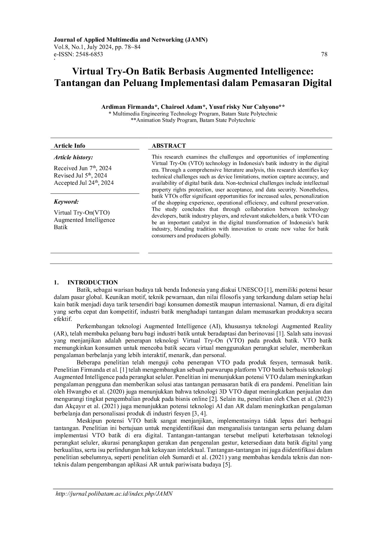 JOURNAL OF APPLIED MULTIMEDIA AND NETWORKINGJOURNAL OF APPLIED MULTIMEDIA AND NETWORKINGPenelitian ini menguji tantangan dan peluang penerapan teknologi Virtual Try-On (VTO) dalam industri batik Indonesia di era digital. Melalui analisis literatur yang komprehensif, penelitian ini mengidentifikasi tantangan teknis utama seperti keterbatasan perangkat, akurasi penangkapan gerakan, dan ketersediaan data batik digital. Tantangan non-teknis mencakup perlindungan hak kekayaan intelektual, penerimaan pengguna, dan keamanan data. Meskipun demikian, VTO batik menawarkan peluang signifikan untuk peningkatan penjualan, personalisasi pengalaman berbelanja, efisiensi operasional, dan pelestarian budaya. Studi ini menyimpulkan bahwa melalui kolaborasi antara pengembang teknologi, pelaku industri batik, dan pemangku kepentingan terkait, VTO batik dapat menjadi katalis penting dalam transformasi digital industri batik Indonesia, memadukan tradisi dengan inovasi untuk menciptakan nilai baru bagi konsumen dan produsen batik di seluruh dunia.