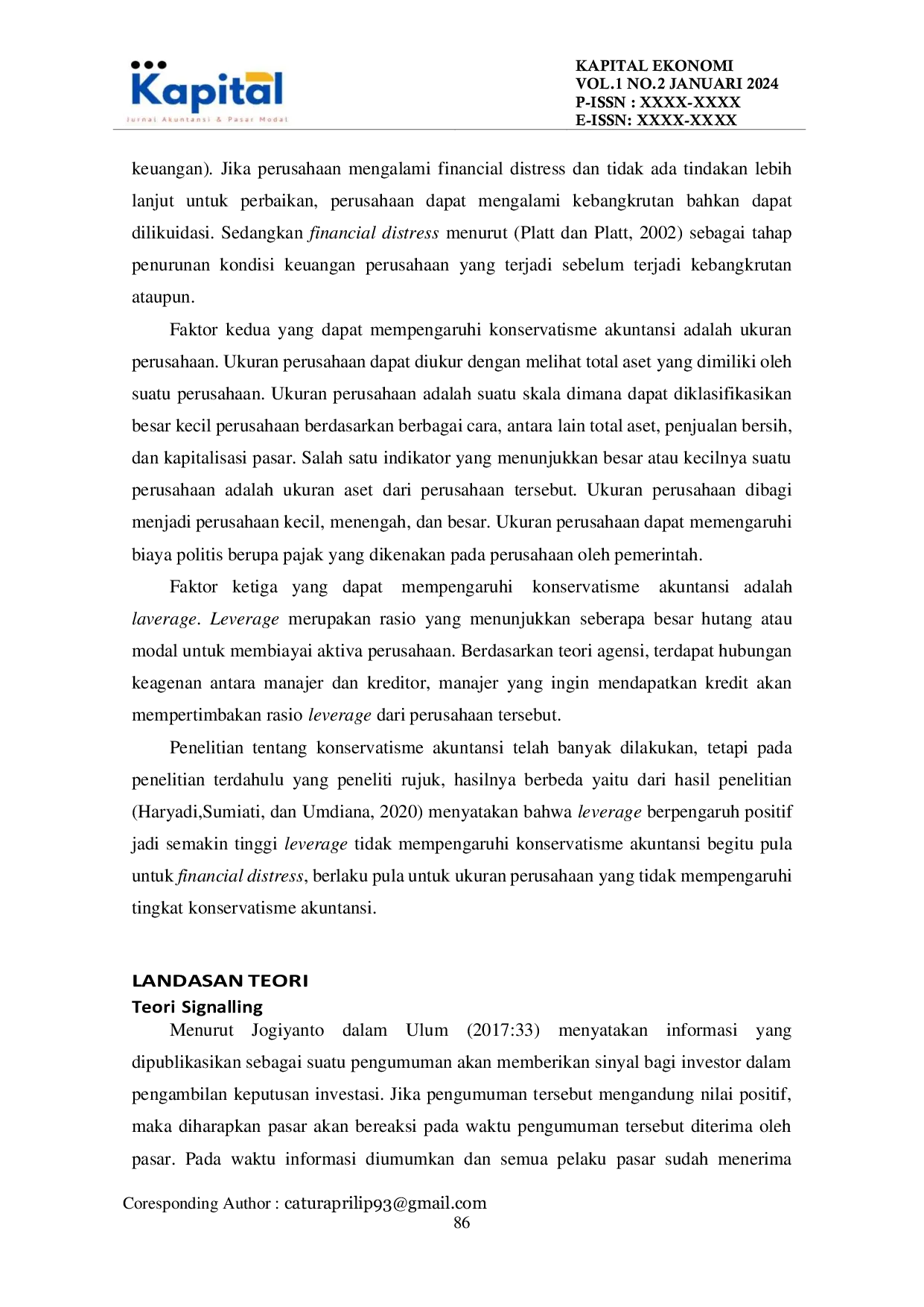 KAPITAL : Jurnal Akutansi & Pasar ModalKAPITAL : Jurnal Akutansi & Pasar ModalPenelitian ini bertujuan untuk menganalisis pengaruh financial distress, ukuran perusahaan, dan leverage terhadap konservatisme akuntansi pada perusahaan manufaktur yang terdaftar di Bursa Efek Indonesia periode 2018–2021. Penelitian ini menggunakan pendekatan kuantitatif dengan data sekunder yang diperoleh dari laporan keuangan perusahaan manufaktur sektor industri dasar dan kimia serta berbagai industri di Bursa Efek Indonesia. Sampel terdiri dari 32 data perusahaan selama empat tahun (2018–2021). Teknik analisis yang digunakan meliputi analisis deskriptif, uji asumsi klasik (normalitas, autokorelasi, heteroskedastisitas, dan multikolinearitas), serta analisis regresi linier berganda yang diproses menggunakan software SPSS 25. Hasil penelitian menunjukkan bahwa financial distress, ukuran perusahaan, dan leverage tidak memiliki pengaruh signifikan terhadap konservatisme akuntansi, baik secara parsial maupun simultan.