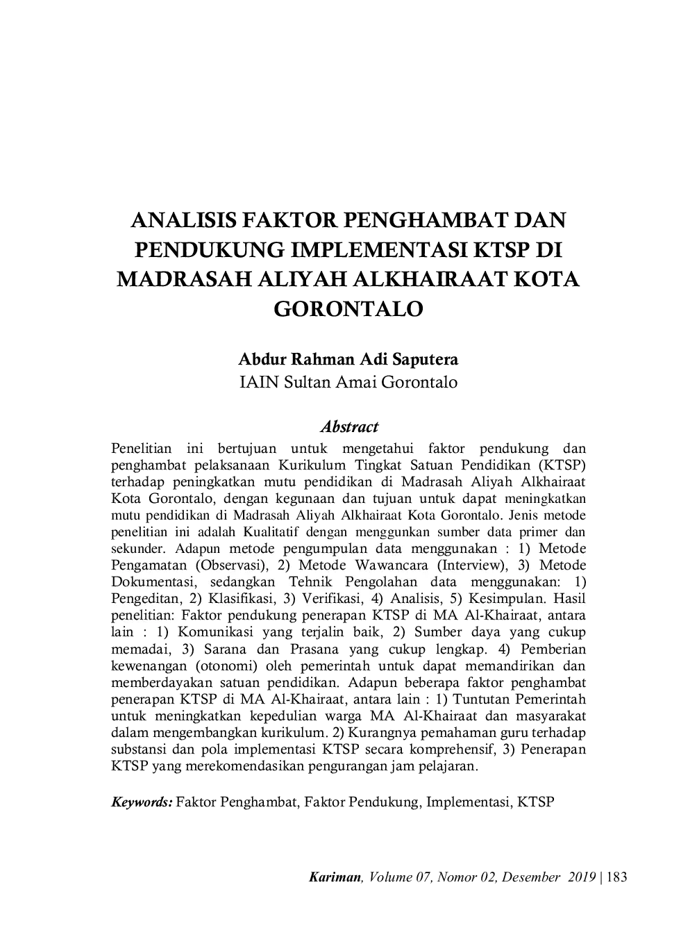 Kariman: Jurnal Pendidikan KeislamanKariman: Jurnal Pendidikan KeislamanPenelitian ini bertujuan untuk mengetahui faktor pendukung dan penghambat pelaksanaan Kurikulum Tingkat Satuan Pendidikan (KTSP) terhadap peningkatan mutu pendidikan di Madrasah Aliyah Alkhairaat Kota Gorontalo, dengan kegunaan dan tujuan untuk dapat meningkatkan mutu pendidikan di Madrasah Aliyah Alkhairaat Kota Gorontalo. Jenis metode penelitian ini adalah Kualitatif dengan menggunkan sumber data primer dan sekunder. Adapun metode pengumpulan data menggunakan : 1) Metode Pengamatan (Observasi), 2) Metode Wawancara (Interview), 3) Metode Dokumentasi, sedangkan Tehnik Pengolahan data menggunakan: 1) Pengeditan, 2) Klasifikasi, 3) Verifikasi, 4) Analisis, 5) Kesimpulan. Hasil penelitian: Faktor pendukung penerapan KTSP di MA Al-Khairaat, antara lain : 1) Komunikasi yang terjalin baik, 2) Sumber daya yang cukup memadai, 3) Sarana dan Prasana yang cukup lengkap. 4) Pemberian kewenangan (otonomi) oleh pemerintah untuk dapat memandirikan dan memberdayakan satuan pendidikan. Adapun beberapa faktor penghambat penerapan KTSP di MA Al-Khairaat, antara lain : 1) Tuntutan Pemerintah untuk meningkatkan kepedulian warga MA Al-Khairaat dan masyarakat dalam mengembangkan kurikulum. 2) Kurangnya pemahaman guru terhadap substansi dan pola implementasi KTSP secara komprehensif, 3) Penerapan KTSP yang merekomendasikan pengurangan jam pelajaran.