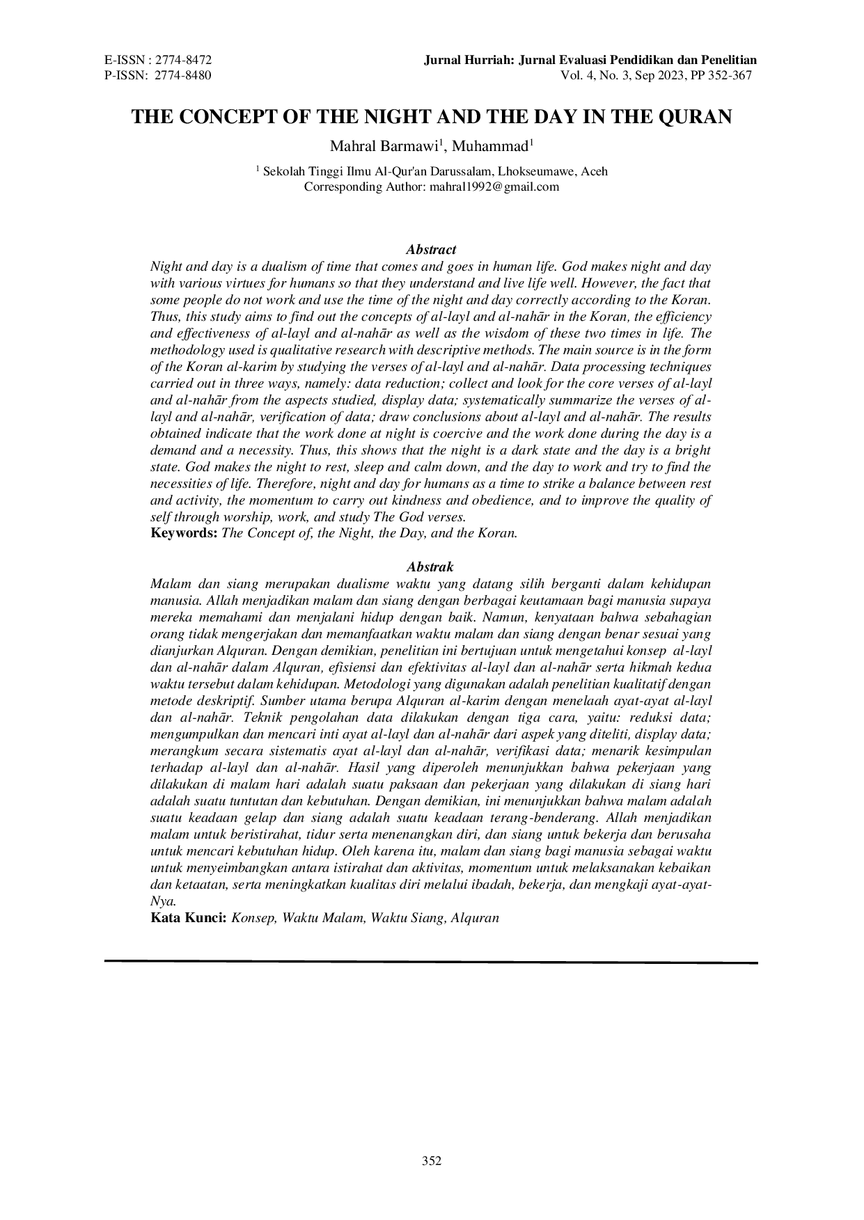 JURNAL HURRIAH: Jurnal Evaluasi Pendidikan dan PenelitianJURNAL HURRIAH: Jurnal Evaluasi Pendidikan dan PenelitianMalam dan siang merupakan dualisme waktu yang datang silih berganti dalam kehidupan manusia. Allah menjadikan malam dan siang dengan berbagai keutamaan bagi manusia supaya mereka memahami dan menjalani hidup dengan baik. Namun, kenyataan bahwa sebagian orang tidak mengerjakan dan memanfaatkan waktu malam dan siang dengan benar sesuai yang dianjurkan Alquran. Dengan demikian, penelitian ini bertujuan untuk mengetahui konsep al‑layl dan al‑nahār dalam Alquran, efisiensi dan efektivitas al‑layl dan al‑nahār serta hikmah kedua waktu tersebut dalam kehidupan. Metodologi yang digunakan adalah penelitian kualitatif dengan metode deskriptif. Sumber utama berupa Alquran al‑karim dengan menelaah ayat‑ayat al‑layl dan al‑nahār. Teknik pengolahan data dilakukan dengan tiga cara, yaitu: reduksi data; mengumpulkan dan mencari inti ayat al‑layl dan al‑nahār dari aspek yang diteliti, display data; merangkum secara sistematis ayat al‑layl dan al‑nahār, verifikasi data; menarik kesimpulan terhadap al‑layl dan al‑nahār.