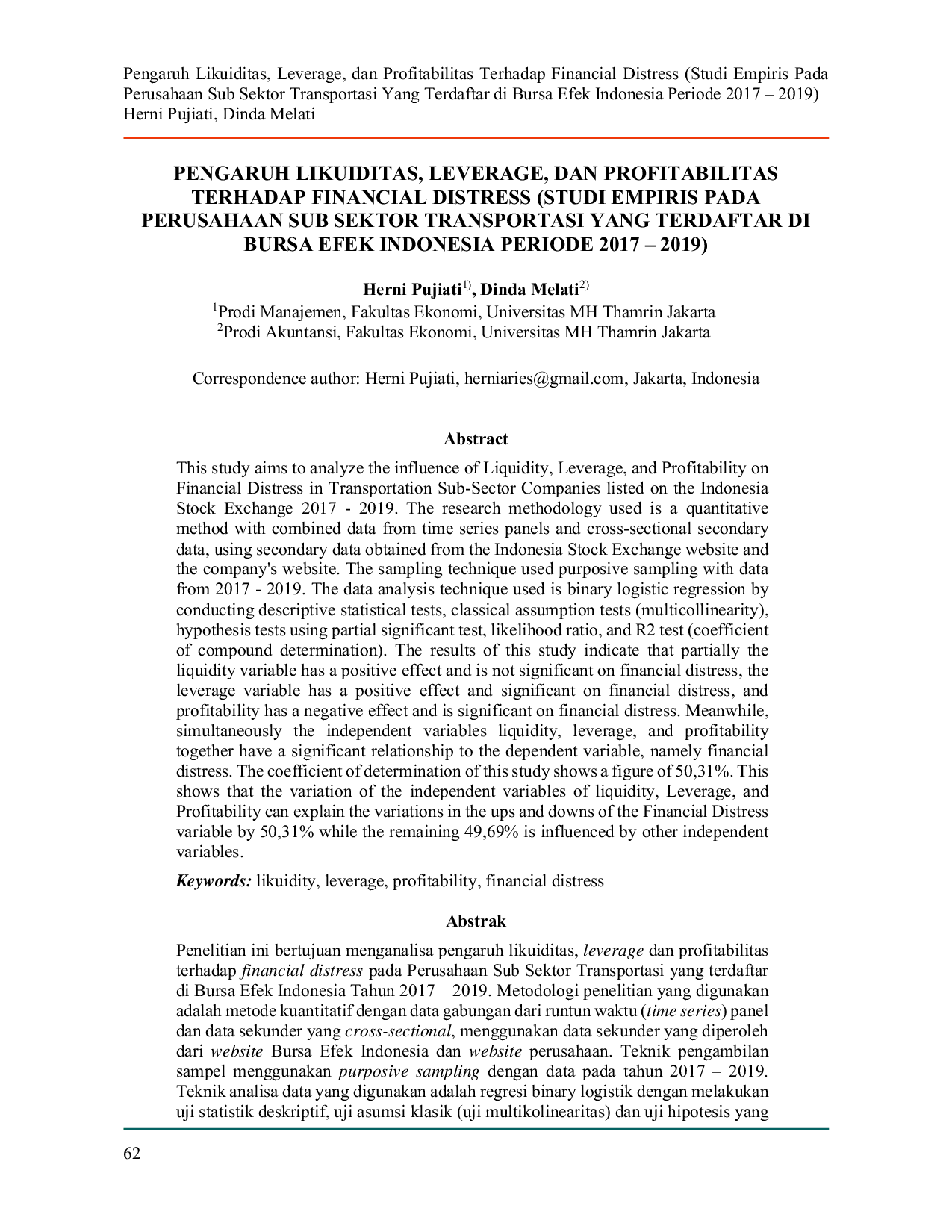 REMITTANCE: JURNAL AKUNTANSI KEUANGAN DAN PERBANKANREMITTANCE: JURNAL AKUNTANSI KEUANGAN DAN PERBANKANPenelitian ini bertujuan menganalisa pengaruh likuiditas, leverage dan profitabilitas terhadap financial distress pada Perusahaan Sub Sektor Transportasi yang terdaftar di Bursa Efek Indonesia Tahun 2017 – 2019. Metodologi penelitian yang digunakan adalah metode kuantitatif dengan data gabungan dari runtun waktu (time series) panel dan data sekunder yang cross-sectional, menggunakan data sekunder yang diperoleh dari website Bursa Efek Indonesia dan website perusahaan. Teknik pengambilan sampel menggunakan purposive sampling dengan data pada tahun 2017 – 2019. Teknik analisa data yang digunakan adalah regresi binary logistik dengan melakukan uji statistik deskriptif, uji asumsi klasik (uji multikolinearitas) dan uji hipotesis yang digunakan adalah uji signifikan parsial, likelihood ratio, dan uji R2 (Koefisien determinasi majemuk). Hasil dari penelitian ini menunjukkan bahwa secara parsial variabel likuiditas berpengaruh positif dan tidak signifikan terhadap financial distress, variabel leverage berpengaruh positif dan signifikan terhadap financial distress, dan variabel profitabilitas berpengaruh negatif dan signifikan terhadap financial distress. Sementara itu secara simultan variabel bebas likuiditas, leverage dan profitabilitas secara bersama-sama memiliki hubungan yang signifikan terhadap variabel terikatnya yaitu financial distress. Koefisien determinasi dari penelitian ini menunjukan angka sebesar 50,31%. Hal ini menunjukan bahwa variasi variabel bebas likuiditas, leverage dan profitabilitas mampu menjelaskan variasi naik turunnya variabel Financial Distress sebesar 50,31% sedangkan sisanya sebesar 49,69% dipengaruhi oleh variabel bebas lainnya.