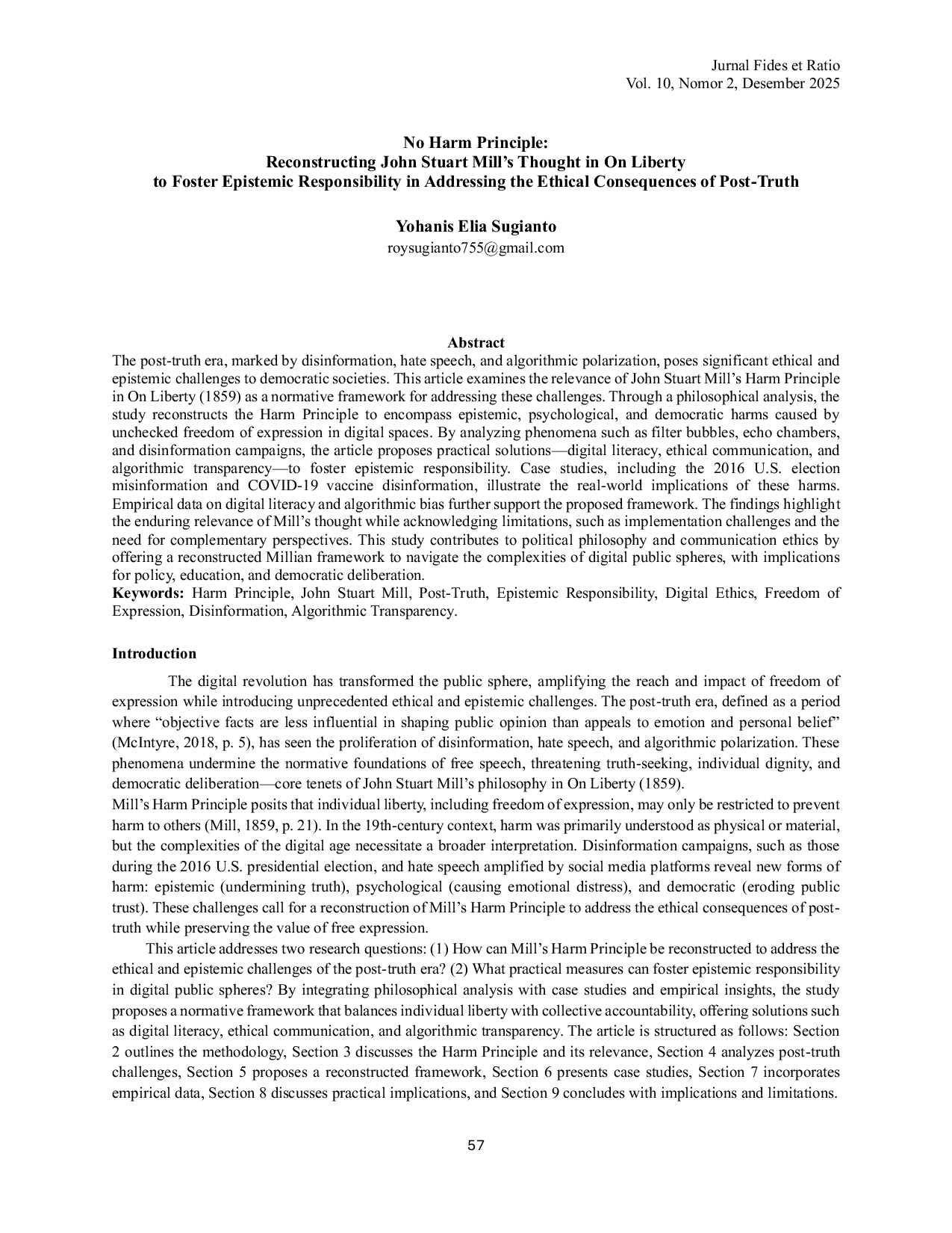Fides et Ratio : Jurnal Teologi Kontekstual Seminari Tinggi St. Fransiskus Xaverius AmbonFides et Ratio : Jurnal Teologi Kontekstual Seminari Tinggi St. Fransiskus Xaverius AmbonEra post-truth, yang ditandai oleh disinformasi, ujaran kebencian, dan polarisasi algoritmik, menimbulkan tantangan etis dan epistemik yang signifikan bagi masyarakat demokratis. Artikel ini mengkaji relevansi Prinsip Kerugian (Harm Principle) John Stuart Mill dalam On Liberty (1859) sebagai kerangka normatif untuk mengatasi tantangan tersebut. Melalui analisis filosofis, penelitian ini merekonstruksi Prinsip Kerugian agar mencakup kerusakan epistemik, psikologis, dan demokratis yang disebabkan oleh kebebasan berekspresi tanpa batas di ruang digital. Dengan menganalisis fenomena seperti filter bubble, ruang gema, dan kampanye disinformasi, artikel ini mengusulkan solusi praktis—literasi digital, komunikasi etis, dan transparansi algoritmik—untuk mendorong tanggung jawab epistemik. Studi kasus, termasuk misinformasi pemilu AS 2016 dan disinformasi vaksin COVID-19, mengilustrasikan implikasi nyata dari kerusakan tersebut. Data empiris mengenai literasi digital dan bias algoritmik lebih lanjut mendukung kerangka yang diusulkan. Temuan menyoroti relevansi berkelanjutan dari pemikiran Mill sambil mengakui keterbatasan, seperti tantangan implementasi dan kebutuhan akan perspektif tambahan. Penelitian ini berkontribusi pada filsafat politik dan etika komunikasi dengan menawarkan kerangka Millian yang direkonstruksi untuk menavigasi kompleksitas ruang publik digital, dengan implikasi bagi kebijakan, pendidikan, dan deliberasi demokratis.
