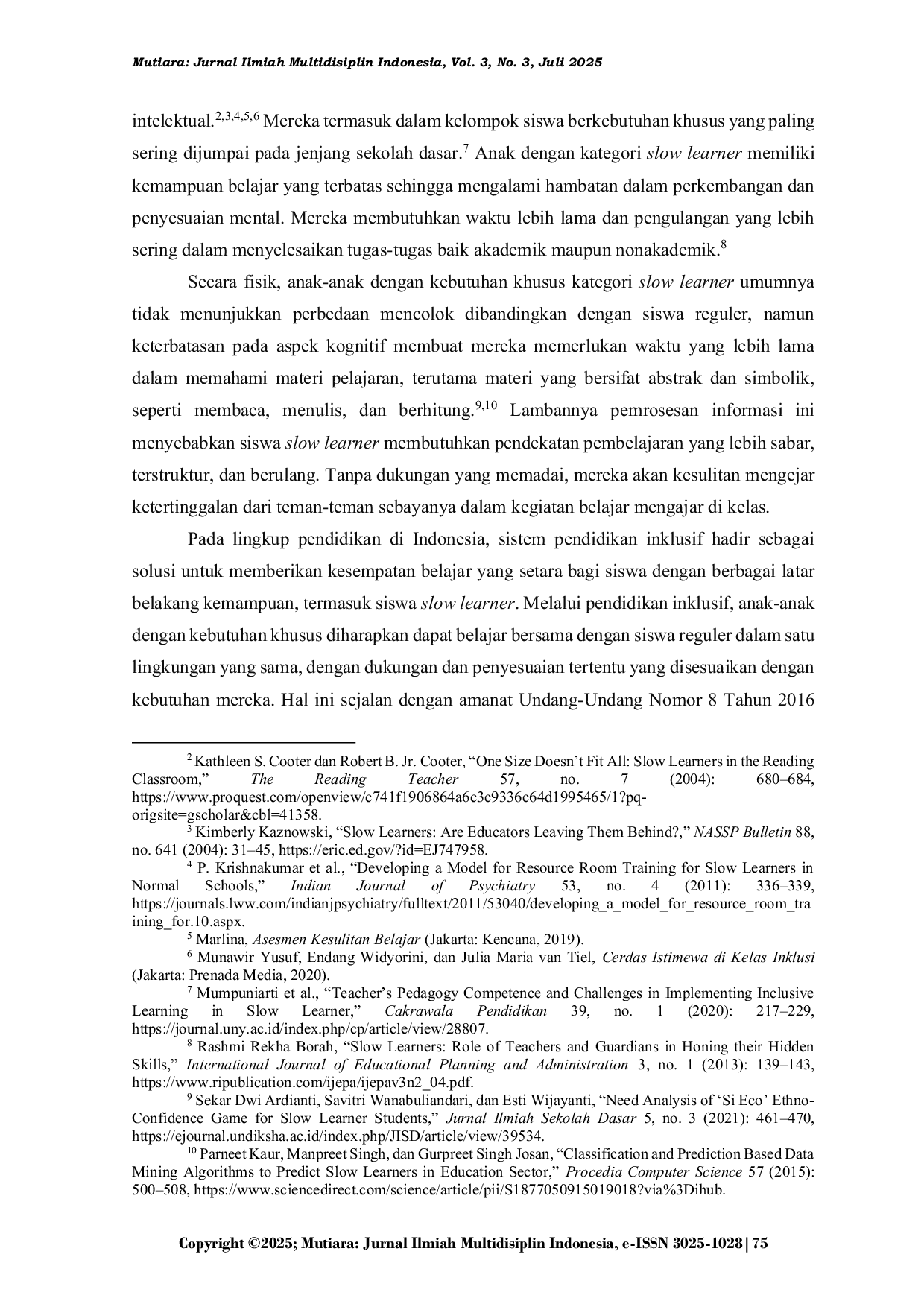 Mutiara: Jurnal Ilmiah Multidisiplin IndonesiaMutiara: Jurnal Ilmiah Multidisiplin IndonesiaKemampuan membaca merupakan dasar penting dalam pembelajaran di tingkat pendidikan dasar, namun anak berkebutuhan khusus dengan kategori slow learner sering mengalami hambatan dalam mengembangkan keterampilan membaca permulaan akibat keterbatasan dalam pemrosesan fonologis. Penelitian ini bertujuan untuk mengetahui efektivitas metode Fonik dalam meningkatkan kemampuan membaca anak slow learner melalui pendekatan intervensi terstruktur. Permasalahan yang diangkat adalah bagaimana metode Fonik dapat diadaptasi secara tepat untuk mengatasi kesulitan membaca pada anak dengan keterlambatan belajar. Subjek penelitian adalah seorang siswa kelas V sekolah dasar yang menunjukkan keterlambatan signifikan dalam mengenali bunyi huruf, menyusun kata, dan memahami struktur kalimat sederhana. Penelitian menggunakan pendekatan studi kasus dengan desain intervensi individual sebanyak enam sesi pembelajaran bertahap. Setiap sesi dirancang untuk melatih keterampilan fonologis, mulai dari identifikasi fonem, penggabungan bunyi menjadi suku kata, segmentasi fonem, hingga pengenalan pola kompleks seperti digraf dan vokal rangkap. Hasil penelitian menunjukkan adanya peningkatan kemampuan membaca yang signifikan, terlihat dari kemajuan dalam mengenali bunyi huruf, membaca kata sederhana, dan merangkai kalimat pendek. Meskipun masih terdapat beberapa kekeliruan dalam pelafalan dan penguasaan struktur kata, perkembangan subjek selama intervensi menunjukkan bahwa metode Fonik merupakan pendekatan yang efektif dan aplikatif dalam pembelajaran membaca bagi anak slow learner. Kesimpulannya, metode Fonik terbukti mampu menjembatani hambatan fonologis melalui strategi yang disesuaikan dengan profil belajar anak. Kebaruan dari penelitian ini terletak pada implementasi metode Fonik sebagai model intervensi fonologis bertahap dalam konteks pendidikan dasar inklusif, yang masih terbatas dalam praktik dan penelitian di Indonesia.