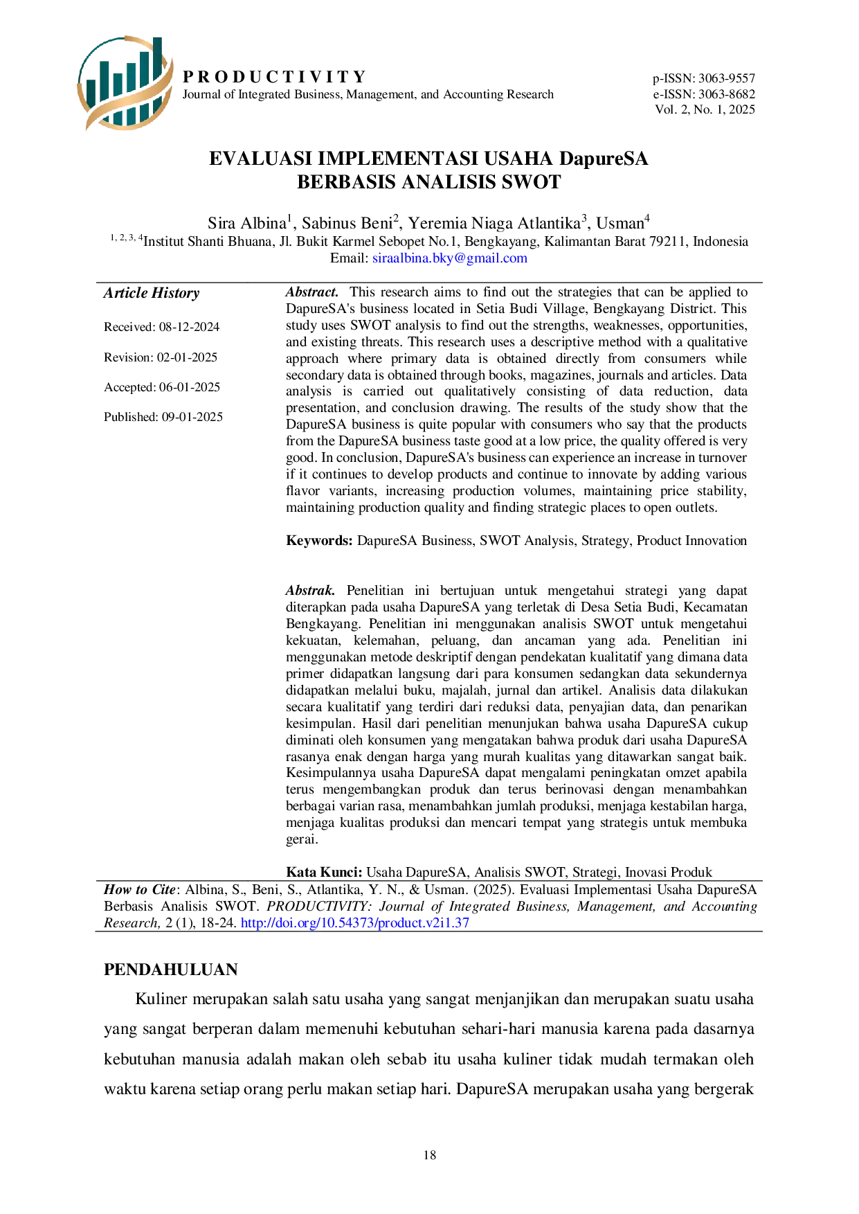 PRODUCTIVITY: Journal of Integrated Business, Management, and Accounting ResearchPRODUCTIVITY: Journal of Integrated Business, Management, and Accounting ResearchPenelitian ini bertujuan untuk mengetahui strategi yang dapat diterapkan pada usaha DapureSA yang terletak di Desa Setia Budi, Kecamatan Bengkayang. Penelitian ini menggunakan analisis SWOT untuk mengetahui kekuatan, kelemahan, peluang, dan ancaman yang ada. Penelitian ini menggunakan metode deskriptif dengan pendekatan kualitatif yang dimana data primer didapatkan langsung dari para konsumen sedangkan data sekundernya didapatkan melalui buku, majalah, jurnal dan artikel. Analisis data dilakukan secara kualitatif yang terdiri dari reduksi data, penyajian data, dan penarikan kesimpulan. Hasil dari penelitian menunjukan bahwa usaha DapureSA cukup diminati oleh konsumen yang mengatakan bahwa produk dari usaha DapureSA rasanya enak dengan harga yang murah kualitas yang ditawarkan sangat baik. Kesimpulannya usaha DapureSA dapat mengalami peningkatan omzet apabila terus mengembangkan produk dan terus berinovasi dengan menambahkan berbagai varian rasa, menambahkan jumlah produksi, menjaga kestabilan harga, menjaga kualitas produksi dan mencari tempat yang strategis untuk membuka gerai.