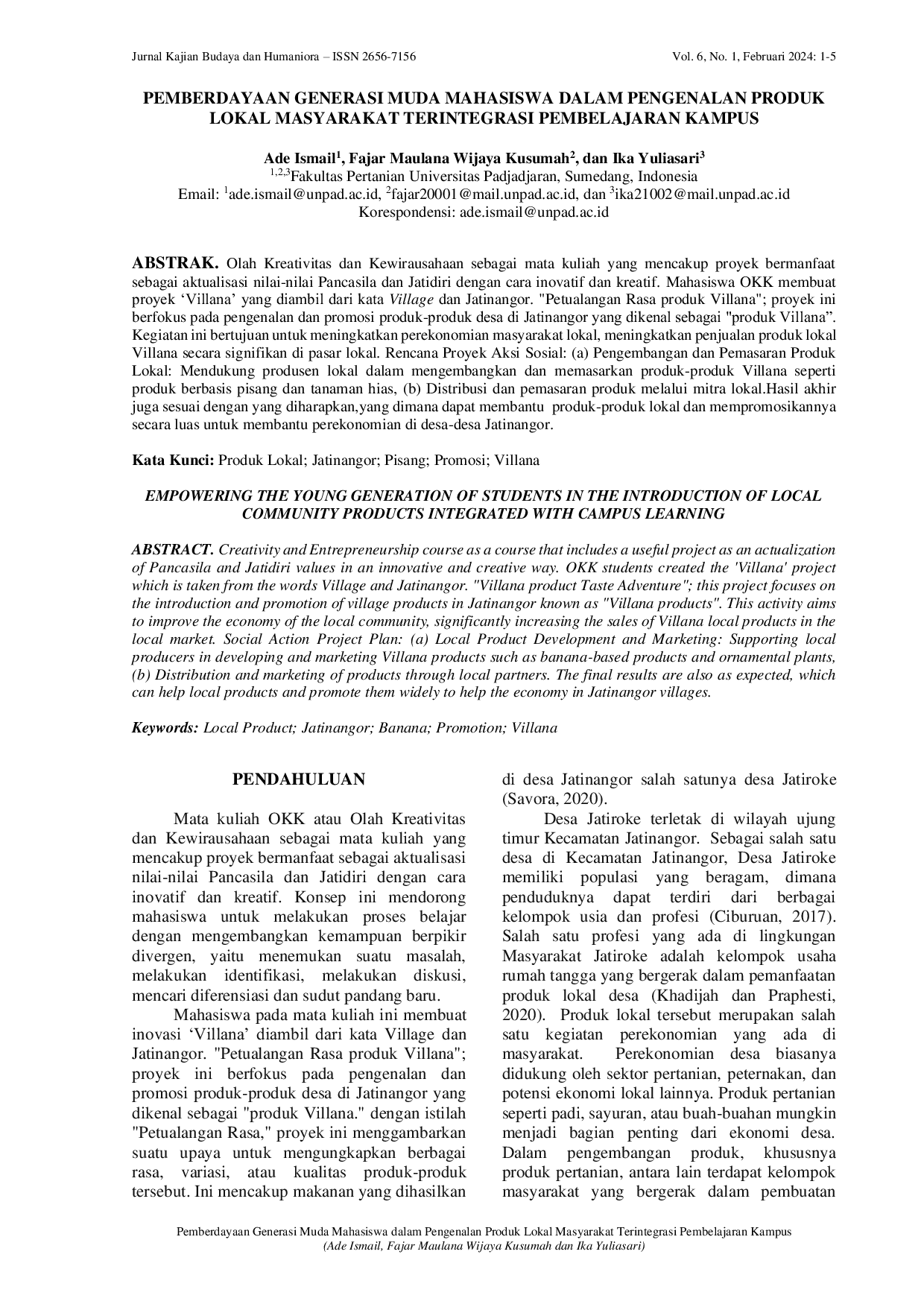 Jurnal Kajian Budaya dan HumanioraJurnal Kajian Budaya dan HumanioraOlah Kreativitas dan Kewirausahaan sebagai mata kuliah yang mencakup proyek bermanfaat sebagai aktualisasi nilai-nilai Pancasila dan Jatidiri dengan cara inovatif dan kreatif. Mahasiswa OKK membuat proyek Villana yang diambil dari kata Village dan Jatinangor.
