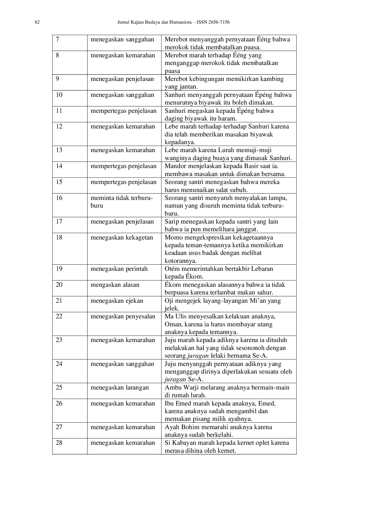 Jurnal Kajian Budaya dan HumanioraJurnal Kajian Budaya dan HumanioraPenelitian penggunaan fatis deuleu dalam fiksi berbahasa Sunda ini bersifat deskriptif‑kualitatif. Data disajikan menggunakan metode simak, yakni simak bebas libat cakap. Data dianalisis menggunakan metode padan referensial dengan pendekatan sosiolinguistik dan semantik. Sumber data sampel yang digunakan berjumlah sembilan buku fiksi berbahasa Sunda dengan pertimbangan terdapatnya sampel data yang diperlukan di dalamnya. Berdasarkan pengamatan atas sumber data tersebut, dipilihlah 28 data kalimat yang di dalamnya memuat fatis deuleu. Dari semua data tersebut penggunaan fatis deuleu ditemukan hanya terdapat dalam tingkat tutur kode akrab. Selanjutnya, ditemukan empat hubungan sosial antara penutur dan mitra tutur dalam penggunaan fatis deuleu ini, yaitu (1) ketetanggaan, (2) kekerabatan, (3) pertemanan, dan (4) kenalan baru dengan jumlah data masing-masing 13, 8, 6, dan 1. Selanjutnya, jika diamati berdasarkan makna konteks kalimat, fatis deuleu yang terdapat dalam kalimat eksklamatif ini dalam penuturan memiliki sebelas jenis makna gramatikal, yaitu (1) menegaskan ketidaksetujuan, (2) menegaskan kemarahan, (3) menegaskan sanggahan, (4) menegaskan penjelasan, (5) menegaskan kekagetan, (6) meminta tidak terburu‑buru, (7) menegaskan perintah, (8) menegaskan alasan, (9) menegaskan ejekan, (10) menegaskan penyesalan, dan (11) menegaskan larangan, masing‑masing ada 1 data. Dengan demikian, hanya digunakan dalam tingkat tutur kode akrab dengan hubungan sosial penutur dengan mitra tutur cenderung ketetanggaan serta dengan makna gramatikal kalimat penutur terhadap mitra tutur menegaskan kemarahan.