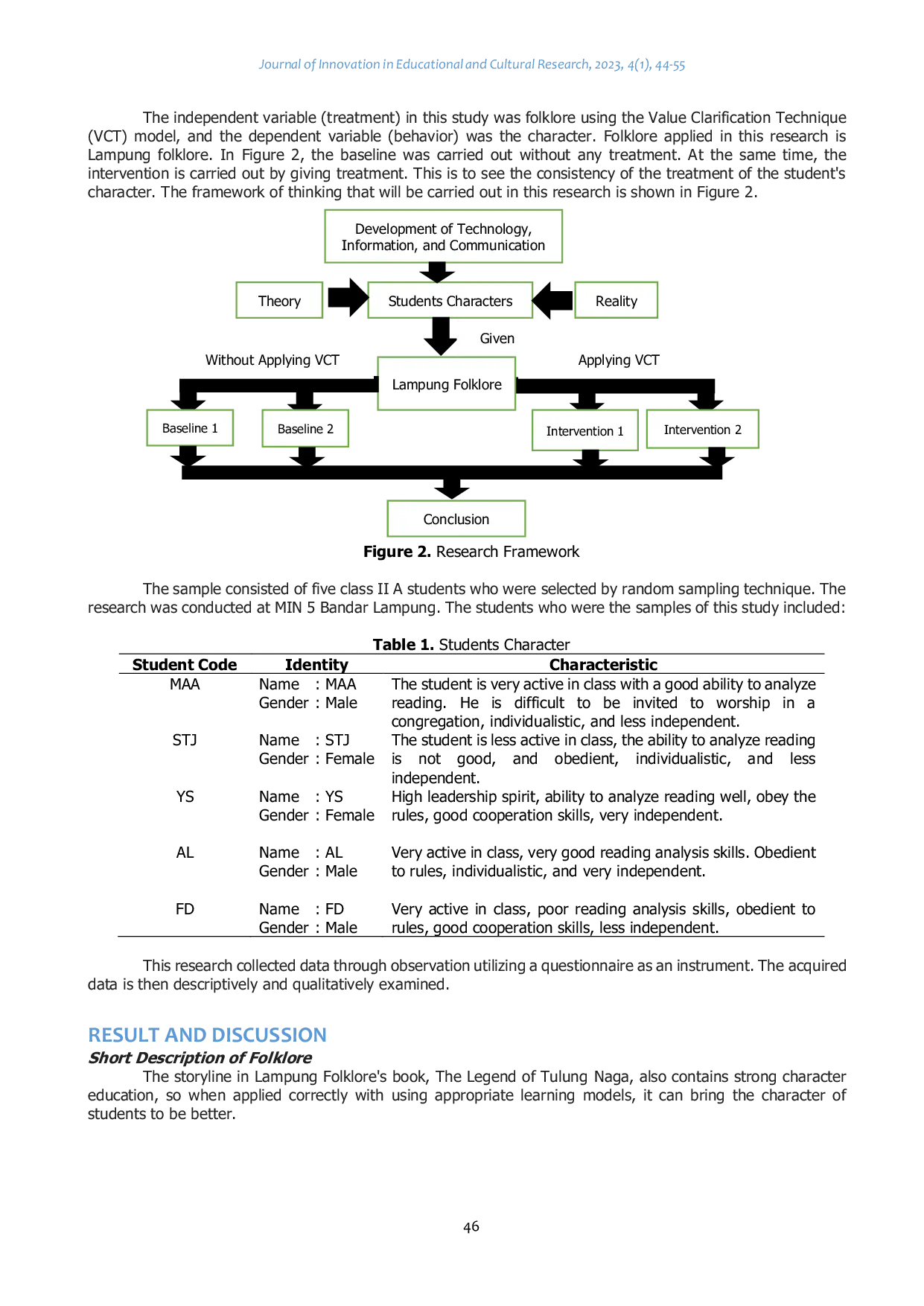 Journal of Innovation in Educational and Cultural ResearchJournal of Innovation in Educational and Cultural ResearchPendidikan karakter perlu diintegrasikan secara memadai ke dalam proses pembelajaran di kelas. Salah satu metode pelaksanaan pendidikan karakter adalah dengan menggunakan media dan model pembelajaran yang tepat. Penelitian ini bertujuan untuk menggambarkan efek penerapan kualitatif buku folklore Lampung “Legenda Tulung Naga serta model Value Clarification Technique (VCT) dalam pembelajaran. Metode yang digunakan adalah Single Subject Rate (SSR) dengan desain A (baseline-1), B (intervensi-1), A (baseline-2), dan B (intervensi-2). Berdasarkan hasil penelitian, karakter siswa berkembang setelah penerapan model VCT dan buku folklore Lampung dalam pembelajaran. Perkembangan ini terlihat pada setiap tahapan penelitian pada tahap A (baseline-1), B (intervensi-1), A (baseline-2), dan B (intervensi-2). Berdasarkan observasi dan kuesioner, terdapat penguatan karakter religius, nasionalisme, kemandirian, kerjasama, dan integritas siswa setelah membaca buku folklore Lampung dan belajar dengan model VCT. Dari temuan tersebut dapat disimpulkan bahwa penggunaan buku cerita yang dipadukan dengan model VCT meningkatkan pendidikan karakter. Penelitian ini menambah pengetahuan tentang penerapan model VCT dengan materi pembelajaran berupa buku cerita legenda untuk memperkuat nilai karakter siswa.