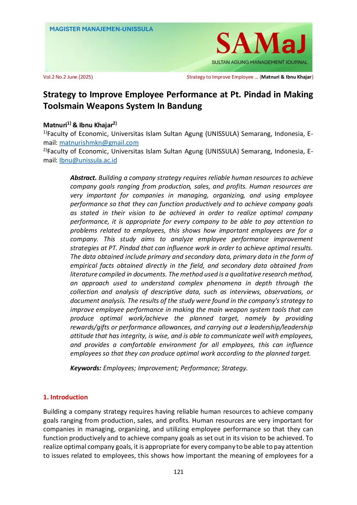 Sultan Agung Management JournalSultan Agung Management JournalMembangun strategi perusahaan membutuhkan sumber daya manusia yang andal untuk mencapai tujuan perusahaan yang mencakup produksi, penjualan, dan keuntungan. Sumber daya manusia sangat penting bagi perusahaan dalam mengelola, mengorganisir, dan memanfaatkan kinerja karyawan agar dapat berfungsi secara produktif dan mencapai tujuan perusahaan sebagaimana tercantum dalam visinya untuk dicapai. Untuk mewujudkan tujuan perusahaan yang optimal, setiap perusahaan perlu memperhatikan masalah terkait karyawan, yang menunjukkan betapa pentingnya karyawan bagi perusahaan. Perusahaan dan karyawan umumnya saling membutuhkan, karyawan adalah aset perusahaan karena tanpa aspek manusia, sulit bagi perusahaan untuk mengembangkan misinya dan mencapai tujuannya. Tidak peduli seberapa canggih peralatan dan perangkat di perusahaan. Karena keberhasilan atau kegagalan perusahaan dalam mencapai tujuannya tidak selalu bergantung pada seberapa canggih teknologi yang dimiliki, jika tidak didukung oleh sumber daya manusia untuk mengendalikan dan mengoperasikan, maka peralatan dan perangkat tidak akan dapat berfungsi sesuai dengan fungsinya. Sumber daya manusia (SDM) yang maksimal untuk produksi sangat diperlukan dalam menjaga dan meningkatkan kualitas perusahaan. Dalam upayanya untuk memanfaatkan Sumber Daya Manusia secara optimal, perusahaan harus mampu memotivasi karyawannya untuk bekerja secara optimal. Mengingat pentingnya sumber daya manusia yang mencakup peran, manajemen, dan pemanfaatan karyawan, diperlukan dorongan untuk mendorong motivasi kerja karyawan. Faktor-faktor yang dapat mempengaruhi peningkatan produktivitas perusahaan antara lain: menyediakan lingkungan kerja yang nyaman, fasilitas kerja/alat yang lengkap yang dapat mendukung kinerja karyawan, memberikan pelatihan dan informasi sehingga mereka akan bekerja terus di perusahaan atau berkomitmen terhadap perusahaan, jika karyawan berkomitmen terhadap perusahaan maka perusahaan akan bergerak ke arah yang positif dan perusahaan akan mencapai target sesuai dengan yang diharapkan. Industri Pertahanan Nasional adalah industri yang membuat peralatan yang digunakan untuk mempertahankan kedaulatan negara, integritas teritorial dan keselamatan seluruh bangsa dari ancaman dan gangguan terhadap integritas bangsa dan negara.