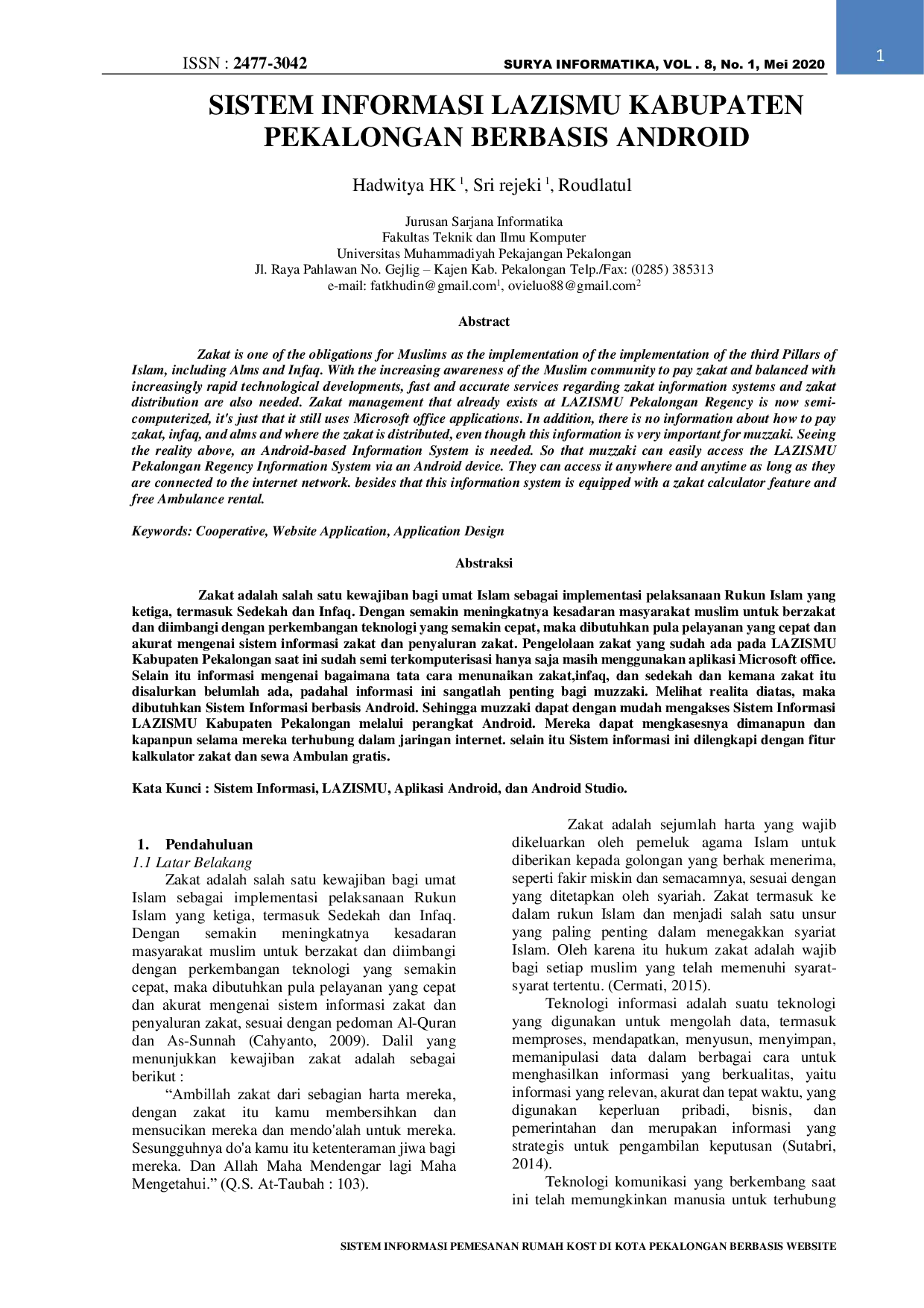 Jurnal Surya InformatikaJurnal Surya InformatikaZakat adalah salah satu kewajiban bagi umat Islam sebagai implementasi pelaksanaan Rukun Islam yang ketiga, termasuk Sedekah dan Infaq. Dengan semakin meningkatnya kesadaran masyarakat muslim untuk berzakat dan diimbangi dengan perkembangan teknologi yang semakin cepat, maka dibutuhkan pula pelayanan yang cepat dan akurat mengenai sistem informasi zakat dan penyaluran zakat. Pengelolaan zakat yang sudah ada pada LAZISMU Kabupaten Pekalongan saat ini sudah semi terkomputerisasi hanya saja masih menggunakan aplikasi Microsoft office. Selain itu informasi mengenai bagaimana tata cara menunaikan zakat, infaq, dan sedekah serta kemana zakat itu disalurkan belumlah ada, padahal informasi ini sangat penting bagi muzzaki. Melihat realita di atas, maka dibutuhkan Sistem Informasi berbasis Android sehingga muzzaki dapat dengan mudah mengakses Sistem Informasi LAZISMU Kabupaten Pekalongan melalui perangkat Android, kapanpun dan dimanapun selama terhubung dengan jaringan internet. Selain itu, sistem informasi ini dilengkapi dengan fitur kalkulator zakat dan layanan sewa ambulan gratis.