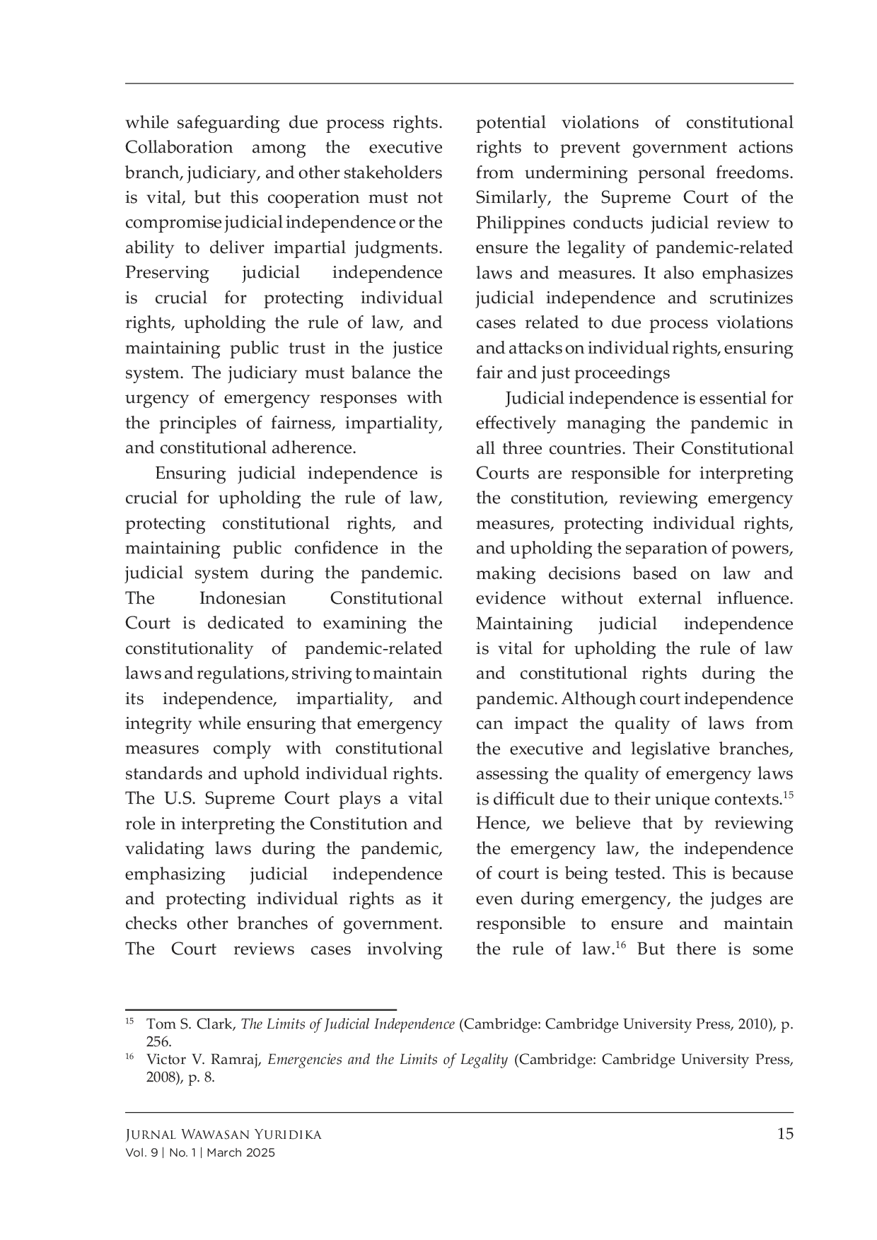 Selama darurat, pemerintah dapat memberlakukan pembatasan hak individu dan lembaga, termasuk Mahkamah Konstitusi, yang dapat merusak kemandirian yudisial.Namun, menjaga kemandirian pengadilan sangat penting untuk mempertahankan supremasi hukum dan fungsi tanpa campur tangan politik.Dalam kasus uji yudisial hukum darurat terkait pandemi, Mahkamah Konstitusi Indonesia memutuskan sebagian ketentuan Perppu No.Oleh karena itu, penting untuk memperkuat kemandirian Mahkamah Konstitusi dalam meninjau regulasi darurat, yang menjadi kunci melindungi hak konstitusi selama krisis kesehatan.