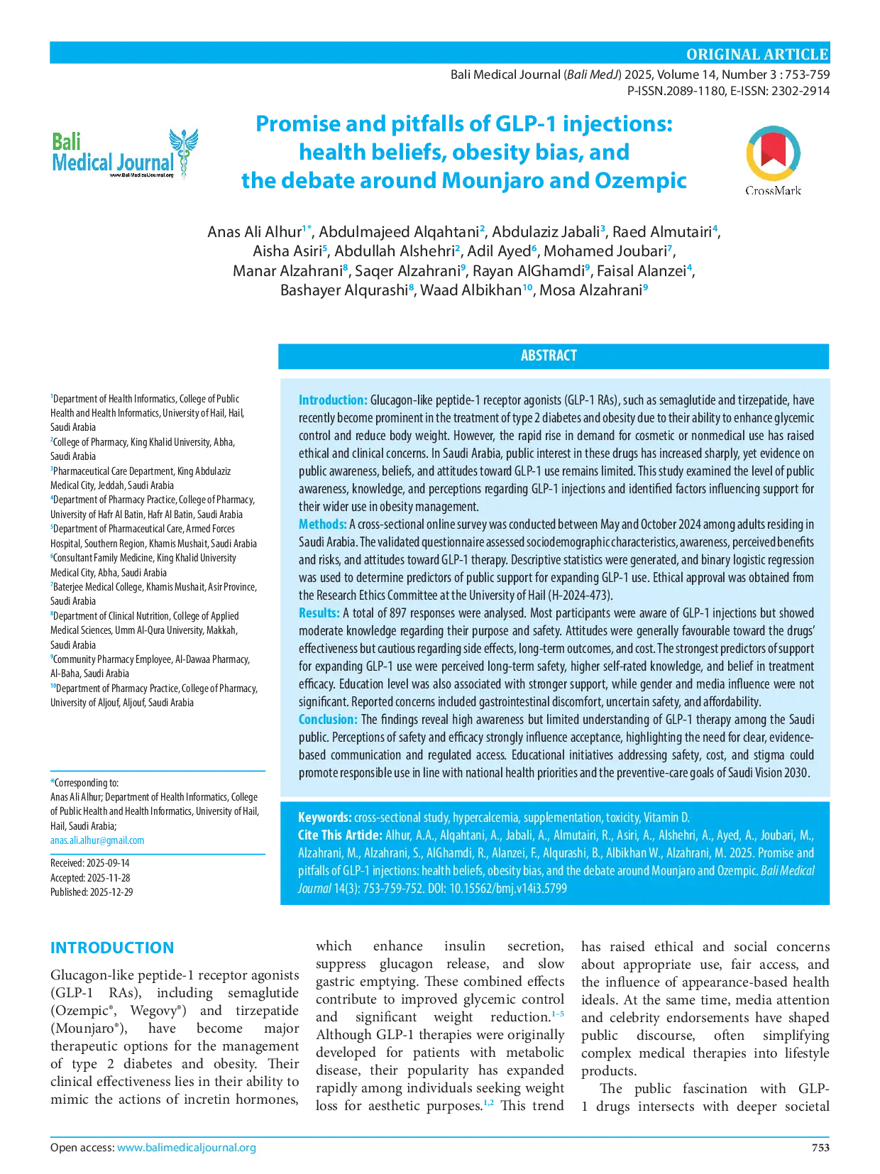 BMJBMJPendahuluan: Agonis reseptor peptida-1 mirip glukagon (GLP-1 RA), seperti semaglutide dan tirzepatide, baru-baru ini menjadi menonjol dalam pengobatan diabetes tipe 2 dan obesitas karena kemampuannya untuk meningkatkan kontrol glikemik dan mengurangi berat badan. Namun, peningkatan pesat dalam permintaan untuk penggunaan kosmetik atau nonmedis telah menimbulkan masalah etika dan klinis. Di Arab Saudi, minat publik terhadap obat-obatan ini telah meningkat tajam, namun bukti tentang kesadaran, kepercayaan, dan sikap publik terhadap penggunaan GLP-1 masih terbatas. Penelitian ini menguji tingkat kesadaran, pengetahuan, dan persepsi publik mengenai suntikan GLP-1 dan mengidentifikasi faktor-faktor yang memengaruhi dukungan untuk penggunaan yang lebih luas dalam pengelolaan obesitas.. Metode: Survei daring potong lintang dilakukan antara bulan Mei dan Oktober 2024 di antara orang dewasa yang tinggal di Arab Saudi. Kuesioner yang telah divalidasi menilai karakteristik sosial demografi, kesadaran, manfaat dan risiko yang dirasakan, dan sikap terhadap terapi GLP-1. Statistik deskriptif dibuat, dan regresi logistik biner digunakan untuk menentukan prediktor dukungan publik untuk memperluas penggunaan GLP-1. Persetujuan etis diperoleh dari Komite Etika Penelitian di Universitas Hail (H-2024-473).. Hasil: Sebanyak 897 tanggapan dianalisis. Sebagian besar peserta menyadari suntikan GLP-1 tetapi menunjukkan pengetahuan sedang mengenai tujuan dan keamanannya. Sikap umumnya mendukung efektivitas obat tetapi berhati-hati mengenai efek samping, hasil jangka panjang, dan biaya. Prediktor terkuat dari dukungan untuk memperluas penggunaan GLP-1 adalah keamanan jangka panjang yang dirasakan, pengetahuan yang dinilai sendiri lebih tinggi, dan kepercayaan pada kemanjuran pengobatan. Tingkat pendidikan juga dikaitkan dengan dukungan yang lebih kuat, sementara jenis kelamin dan pengaruh media tidak signifikan. Kekhawatiran yang dilaporkan termasuk ketidaknyamanan pencernaan, keamanan yang tidak pasti, dan keterjangkauan.. Kesimpulan: Temuan mengungkapkan kesadaran yang tinggi tetapi pemahaman yang terbatas tentang terapi GLP-1 di antara masyarakat Saudi. Persepsi tentang keamanan dan kemanjuran sangat memengaruhi penerimaan, menyoroti perlunya komunikasi yang jelas dan berbasis bukti serta akses yang diatur. Inisiatif pendidikan yang membahas keamanan, biaya, dan stigma dapat meningkatkan penggunaan yang bertanggung jawab sejalan dengan prioritas kesehatan nasional dan tujuan perawatan preventif dari Saudi Vision 2030.