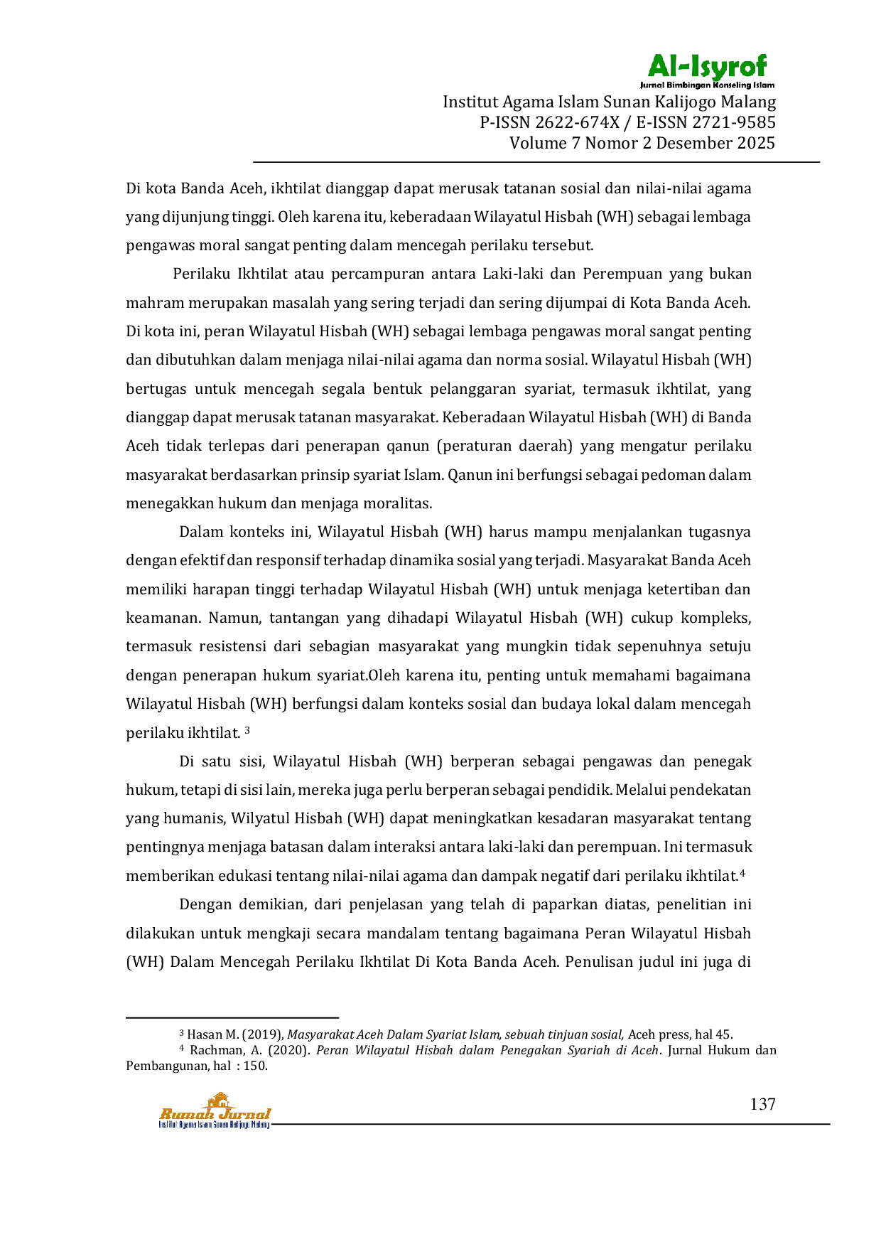 Al-Isyrof: Jurnal Bimbingan Konseling IslamAl-Isyrof: Jurnal Bimbingan Konseling IslamIkhtilat merupakan percampuran antara laki-laki dan perempuan yang bukan mahram dan melakukan interaksi secara berlebihan di tempat umum seperti di cafe-cafe dan tempat umum lainnya, yang mana hal ini dapat berpotensi untuk menimbulkan maksiat diantara keduanya. Di kota Banda Aceh meskipun telah diterapkan syariat secara kaffah akan tetapi masih banyak ditemukan muda-mudi yang melakukan Ikhtilat tersebut. Maka dari itu penelitian ini bertujuan untuk menganalisis dan mendeskripsikan peran serta efektivitas Wilayatul Hisbah (WH). Sebagai lembaga penegak Qanun Syariat Islam di Kota Banda Aceh. Dalam upaya pencegahan perilaku ikhtilat. Metode penelitian yang digunakan adalah kualitatif deskriptif dengan pendekatan studi kasus, melibatkan wawancara mendalam dengan anggota WH, tokoh masyarakat, dan observasi langsung di lapangan. Hasil penelitian menunjukkan bahwa WH menjalankan peran pencegahan melalui tiga fungsi utama: (1) Edukasi dan Sosialisasi Qanun tentang ketertiban umum dan akhlak; (2) Patroli Rutin dan Pengawasan di lokasi-lokasi rawan ikhtilat seperti kafe, taman, dan tempat wisata; serta (3) Penindakan dan Pembinaan terhadap pelanggar. Meskipun WH telah berperan signifikan dalam menekan angka pelanggaran, tantangan utama yang dihadapi meliputi keterbatasan sumber daya manusia, dinamika pergaulan kaum muda, dan perlunya sinergi yang lebih kuat dengan lembaga terkait lainnya.