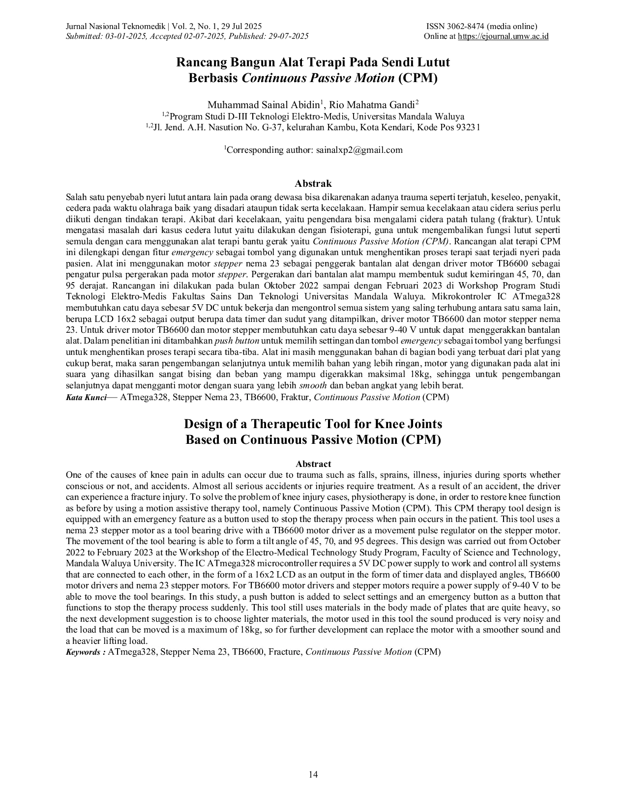 Jurnal Nasional TeknomedikJurnal Nasional TeknomedikSalah satu penyebab nyeri lutut antara lain pada orang dewasa bisa dikarenakan adanya trauma seperti terjatuh, keseleo, penyakit, cedera pada waktu olahraga baik yang disadari ataupun tidak serta kecelakaan. Hampir semua kecelakaan atau cidera serius perlu diikuti dengan tindakan terapi. Akibat dari kecelakaan, yaitu pengendara bisa mengalami cidera patah tulang (fraktur). Untuk mengatasi masalah dari kasus cedera lutut yaitu dilakukan dengan fisioterapi, guna untuk mengembalikan fungsi lutut seperti semula dengan cara menggunakan alat terapi bantu gerak yaitu Continuous Passive Motion (CPM). Rancangan alat terapi CPM ini dilengkapi dengan fitur emergency sebagai tombol yang digunakan untuk menghentikan proses terapi saat terjadi nyeri pada pasien. Alat ini menggunakan motor stepper nema 23 sebagai penggerak bantalan alat dengan driver motor TB6600 sebagai pengatur pulsa pergerakan pada motor stepper. Pergerakan dari bantalan alat mampu membentuk sudut kemiringan 45, 70, dan 95 derajat. Rancangan ini dilakukan pada bulan Oktober 2022 sampai dengan Februari 2023 di Workshop Program Studi Teknologi Elektro-Medis Fakultas Sains Dan Teknologi Universitas Mandala Waluya. Mikrokontroler IC ATmega328 membutuhkan catu daya sebesar 5V DC untuk bekerja dan mengontrol semua sistem yang saling terhubung antara satu sama lain, berupa LCD 16x2 sebagai output berupa data timer dan sudut yang ditampilkan, driver motor TB6600 dan motor stepper nema 23. Untuk driver motor TB6600 dan motor stepper membutuhkan catu daya sebesar 9-40 V untuk dapat menggerakkan bantalan alat. Dalam penelitian ini ditambahkan push button untuk memilih settingan dan tombol emergency sebagai tombol yang berfungsi untuk menghentikan proses terapi secara tiba-tiba. Alat ini masih menggunakan bahan di bagian bodi yang terbuat dari plat yang cukup berat, maka saran pengembangan selanjutnya untuk memilih bahan yang lebih ringan, motor yang digunakan pada alat ini suara yang dihasilkan sangat bising dan beban yang mampu digerakkan maksimal 18kg, sehingga untuk pengembangan selanjutnya dapat mengganti motor dengan suara yang lebih smooth dan beban angkat yang lebih berat.