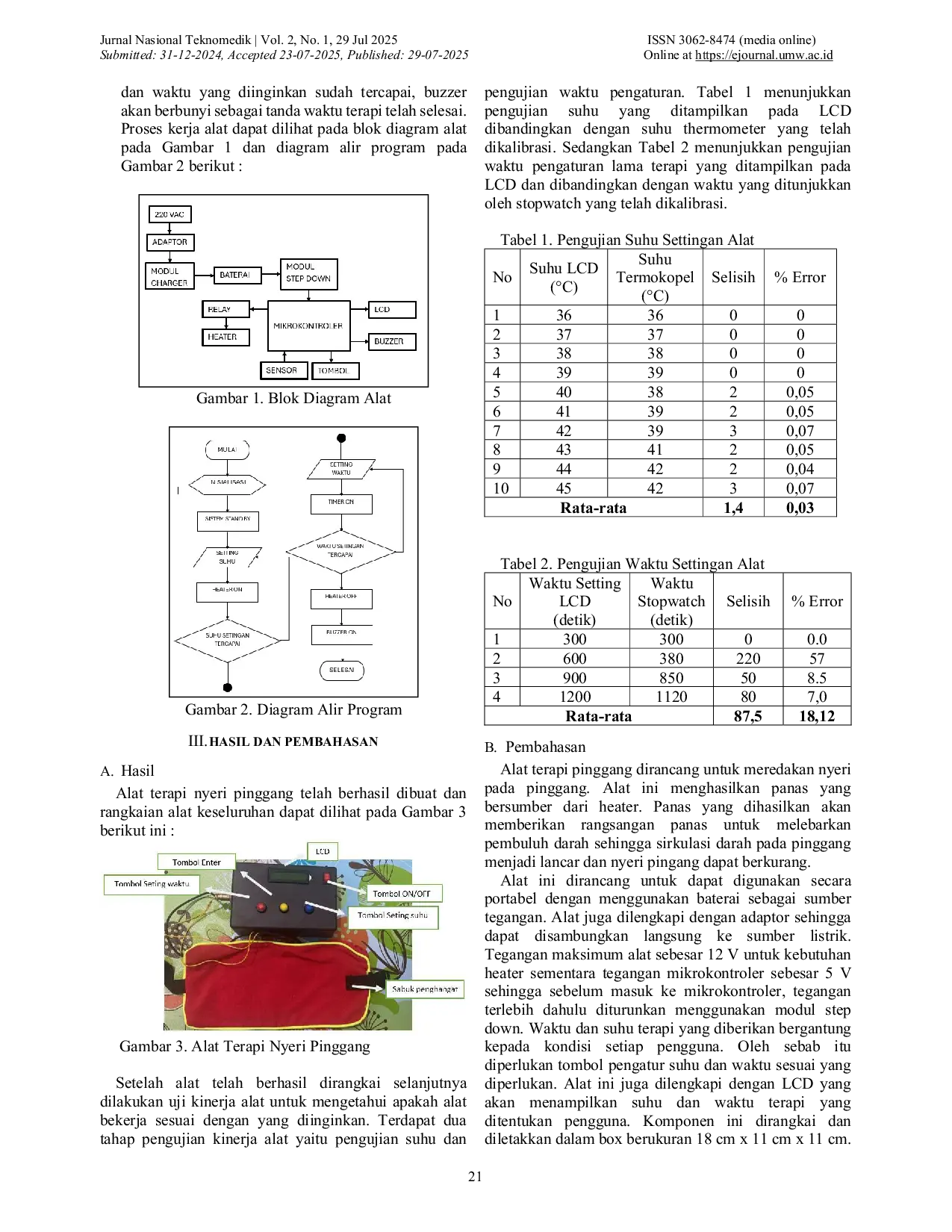 Pertama, perlu dikembangkan penelitian tentang efektivitas alat ini terhadap berbagai tingkat keparahan nyeri pinggang, apakah alat ini lebih efektif untuk nyeri ringan, sedang, atau berat, dan bagaimana respons fisiologis pengguna terhadap terapi panas suhu 42°C dalam durasi berbeda. Kedua, sebaiknya dilakukan studi lanjutan untuk mengintegrasikan fitur pengaturan otomatis berbasis kondisi fisiologis pengguna, seperti deteksi suhu kulit secara real-time dan penyesuaian durasi terapi secara adaptif menggunakan algoritma pada mikrokontroler, agar terapi lebih personal dan aman. Ketiga, perlu penelitian mengenai desain ergonomis alat dalam jangka panjang, termasuk analisis kenyamanan penggunaan harian, kemungkinan iritasi kulit, serta portabilitas perangkat saat digunakan dalam aktivitas dinamis, guna memastikan alat tidak hanya akurat secara teknis namun juga layak digunakan secara klinis dan praktis dalam kehidupan sehari-hari.