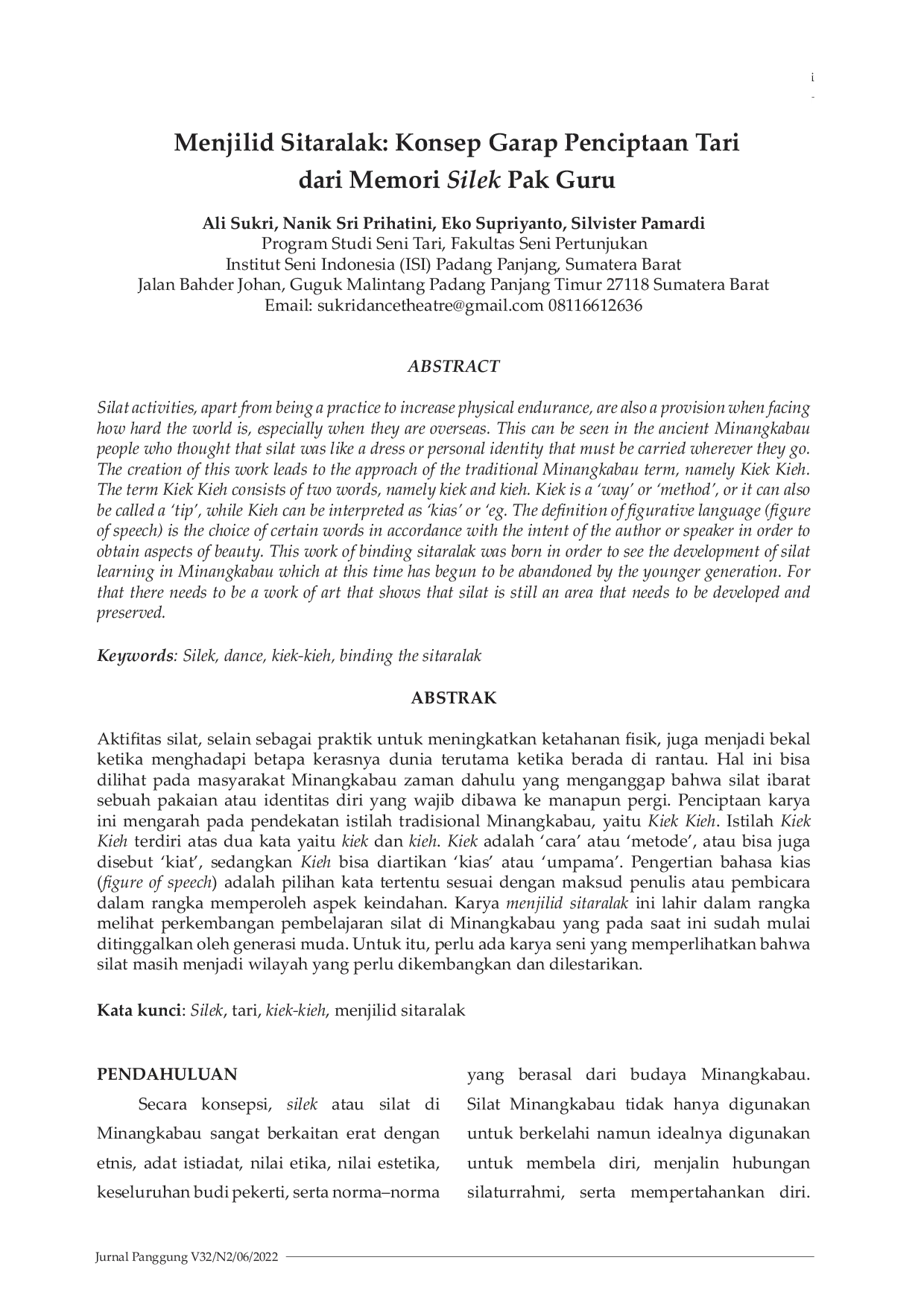 PanggungPanggungAktifitas silat, selain sebagai praktik untuk meningkatkan ketahanan fisik, juga menjadi bekal ketika menghadapi betapa kerasnya dunia terutama ketika berada di rantau. Hal ini bisa dilihat pada masyarakat Minangkabau zaman dahulu yang menganggap bahwa silat ibarat sebuah pakaian atau identitas diri yang wajib dibawa ke manapun pergi. Penciptaan karya ini mengarah pada pendekatan istilah tradisional Minangkabau, yaitu Kiek Kieh. Istilah Kiek Kieh terdiri atas dua kata yaitu kiek dan kieh. Kiek adalah cara atau metode, atau bisa juga disebut kiat, sedangkan Kieh bisa diartikan kias atau umpama. Pengertian bahasa kias (figure of speech) adalah pilihan kata tertentu sesuai dengan maksud penulis atau pembicara dalam rangka memperoleh aspek keindahan. Karya menjilid sitaralak ini lahir dalam rangka melihat perkembangan pembelajaran silat di Minangkabau yang pada saat ini sudah mulai ditinggalkan oleh generasi muda. Untuk itu, perlu ada karya seni yang memperlihatkan bahwa silat masih menjadi wilayah yang perlu dikembangkan dan dilestarikan.