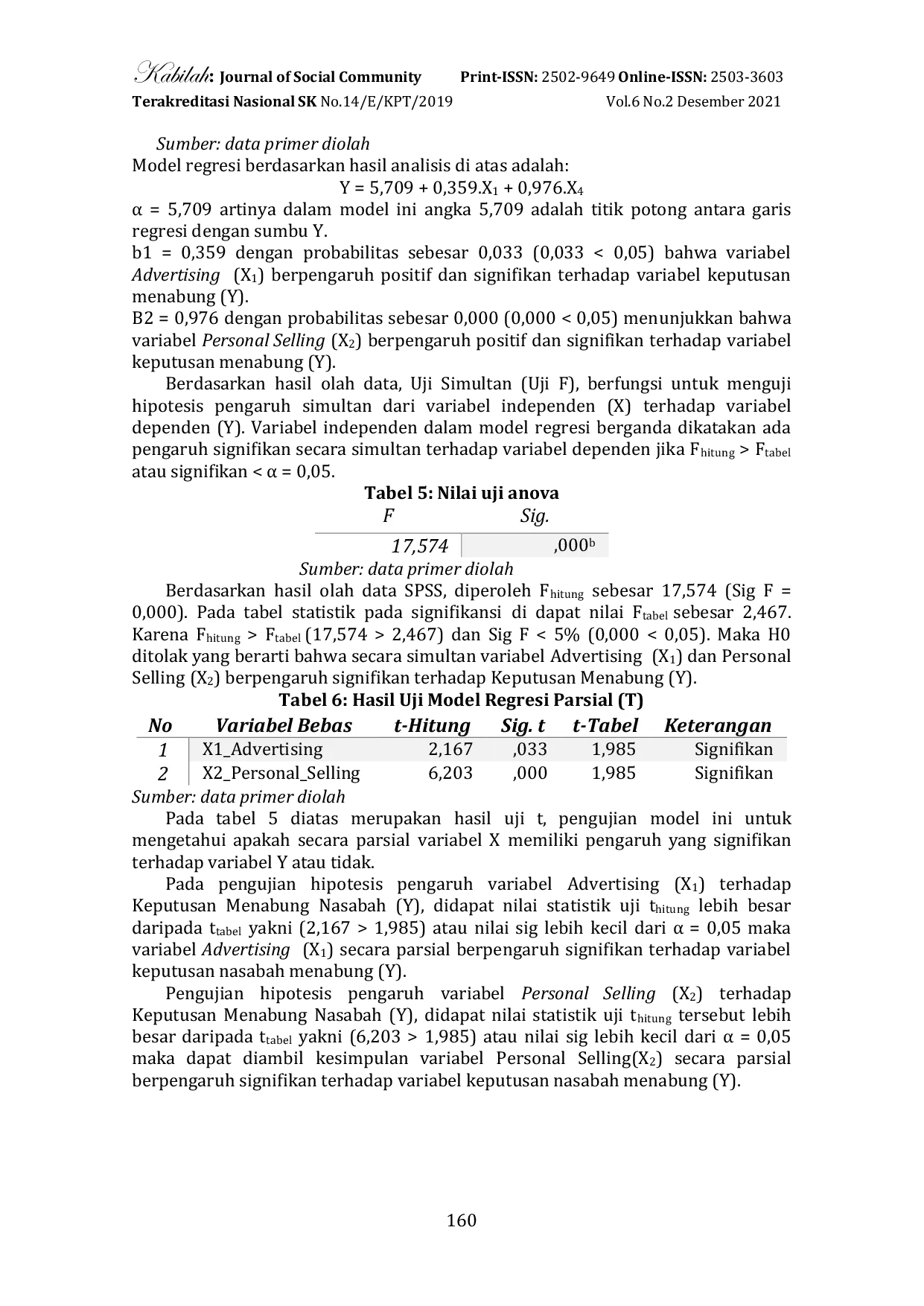 Kabillah : Journal of Social CommunityKabillah : Journal of Social CommunityPromosi merupakan seni dan ilmu serta arus informasi atau persuasi satu arah yang dapat memandu organisasi atau individu untuk menciptakan antara pembeli dan penjual. Iklan dan Personal Selling merupakan sarana promosi yang paling ampuh untuk memikat nasabah. Tujuan penelitian ini untuk menganalisis pengaruh perikalan, dan Personal Selling terhadap keputusan menabung di BMT UGT Sidogiri Muncar. Jenis penelitian ini adalah kuantitatif. Sampel penelitian ini sebanyak 100 orang dengan menggunakan rumus solvin. Metode pengumpulan data dalam ini menggunakan kuesioner dan dokumentasi. Analisis data penelitian menggunakan uji validitas, uji normalitas, uji asumsi klasik, dan uji analisis linear berganda dengan menggunakan software SPSS. Hasil penelitian ini menunjukkan bahwa Advertising (X1) dan Personal Selling (X2) berpengaruh signifikan positif baik secara simultan dan parsial terhadap keputusan menabung. serta nilai R Square sebesar 0,478 atau 47,8%. Sedangkan sisanya sebesar 52,2% dijelaskan oleh variabel lain diluar model penelitian ini.