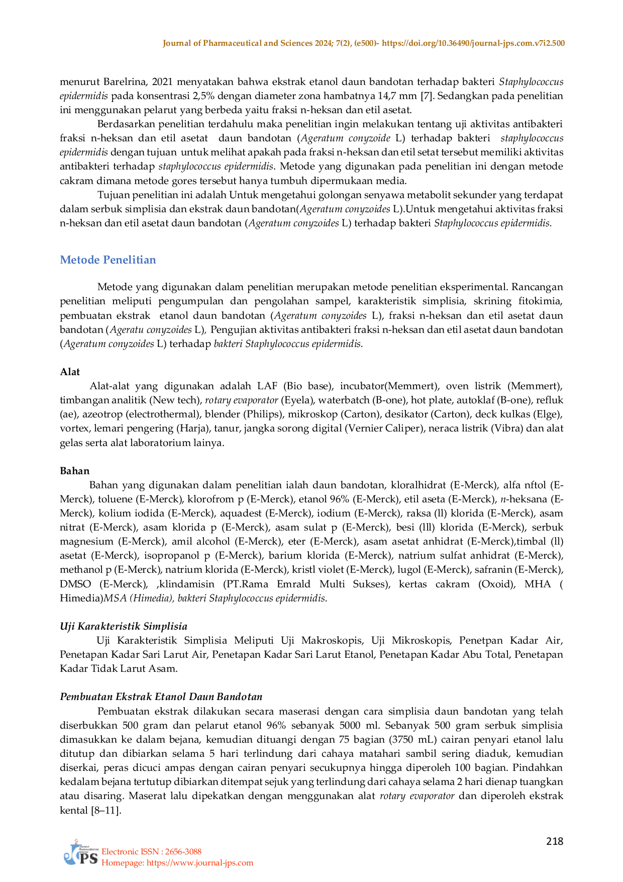 Journal of Pharmaceutical and SciencesJournal of Pharmaceutical and SciencesBandotan (Ageratum conyzoides L) merupakan tanaman liar yang mudah ditemukan di Indonesia, dikenal memiliki khasiat obat dan bersifat antibakteri. Tujuan dari penelitian ini untuk mengetahui aktivitas antibakteri fraksi n-heksan dan etil asetat daun bandotan (Ageratum Conyzoides L) terhadap bakteri Staphylococcus epidermidis. Penelitian ini dilakukan dengan metode eksperimental dengan meliputi pengumpulan sampel, pemeriksaaan makroskopis, pemeriksaan mikroskopis, pembuatan simplisia, pemeriksaan karakteristik, skrining fitokima, pembuatan ekstrak etanol, kemudian difraksinasi, selanjutnya dilakukan pengujian aktivitas antibakteri terhadap bakteri Staphylococcus epidermidis dengan metode difusi disk. Data yang diperoleh dari diameter daya hambat dianalisis secara statistic menggunakan uji Anova, kemudian dilanjutkan dengan uji Kruskal-Wallis dan uji Ducan. Hasil pemeriksaan makroskopik, dengan warna hijau tua, berbentuk bundar telur, duan runcing, pangkal daun tumpul, pinggir daun bergerigi, tulang daun pada permukaan atas dan bawah berambut, warna rambut putih dan tulang daun menyirip. Hasil pemeriksaan mikroskopik terdapat pada daun melintang yaitu kolenkim, epidermis atas dan sel sekresi , pada serbuk yaitu rambut penutup, mesofil dan Stomata tipe anomositik. Hasil karakteristik simplisia diperoleh kadar air 7,3%, kadar sari larut dalam air 32,72%, kadar sari larut dalam etanol 42,5%, kadar abu total 3,3% dan kadar abu tidak larut asam 1,8%. Skrining fitokimia serbuk simplisia dan ekstrak menunjukkan adanya kandungan alkaloid, glikosida, flavonoid, tannin, saponin dan steroid. Hasil uji aktivitas antibakteri fraksi n-heksan pada bakteri Staphylococcus Epidermidis pada konsentrasi 10%, 30%, 50% dan 70% termasuk kategori resistant. Sedangkan fraksi Etil asetat konsentrasi 10%,30% dan 50% adalah kategori resistant, pada konsentarsi 70% termasuk kategori Intermediate. Sehingga dapat disimpulkan bahwa fraksi n-heksan dan etil asetat daun bandotan (Ageratum conyziodes L) memiliki aktivitas terhadap bakteri Staphylococcus epidermidis.