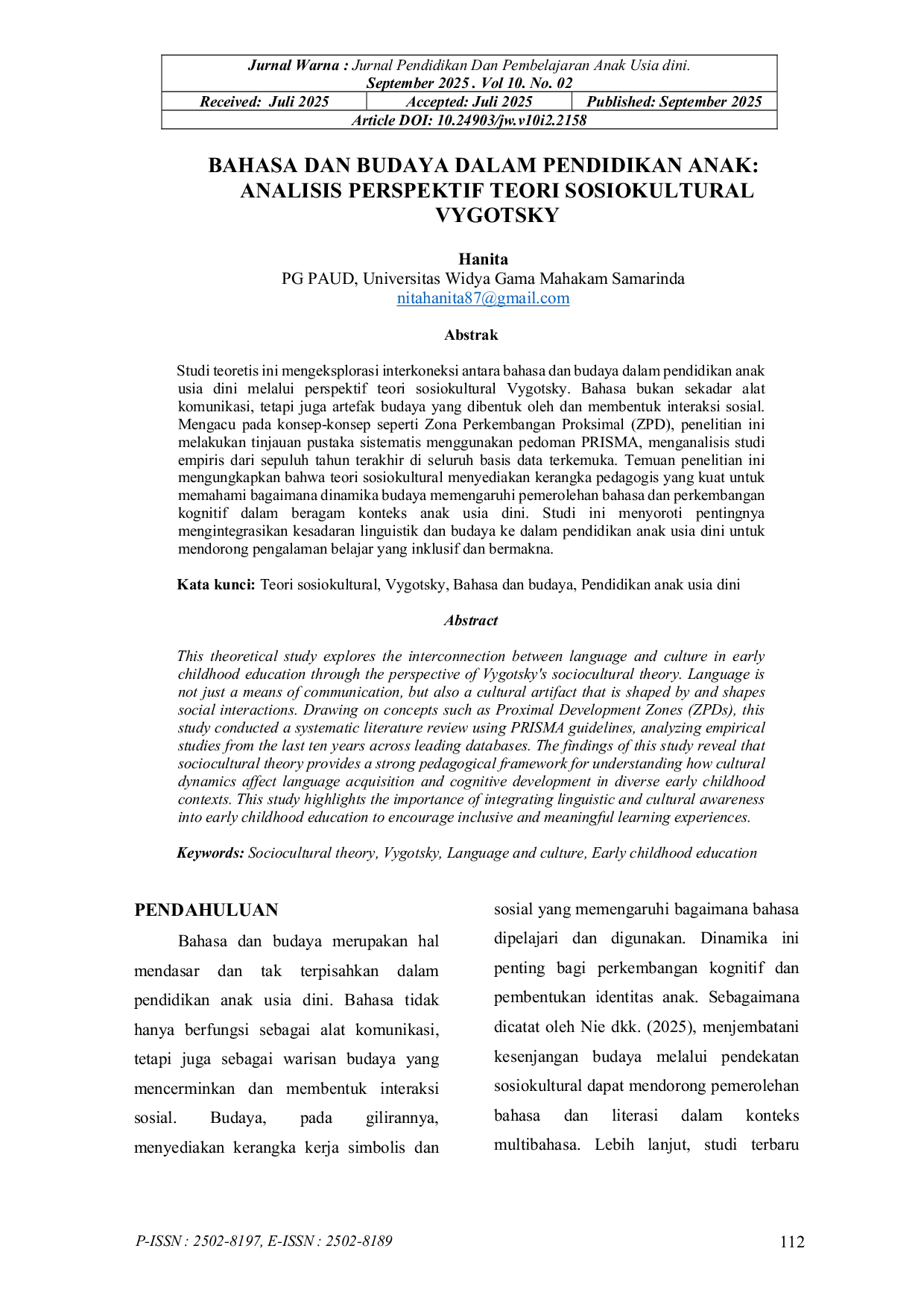 - Bahasa dan budaya dalam pendidikan anak : Analisis perspektif teori sosiokultural Vygotsky | Jurnal Warna... doi.org/10.24903/jw.v10i2.2158Bahasa dan budaya dalam pendidikan anak Analisis perspektif teori sosiokultural Vygotsky Jurnal Warna doi 10 24903 jw v10i2 2158