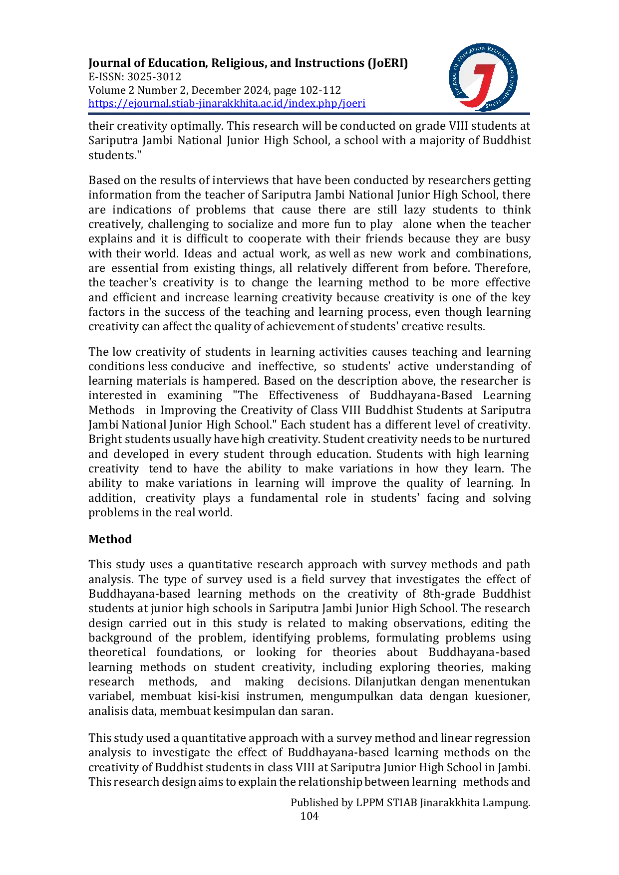Journal of Education, Religious, and Instructions (JoERI)Journal of Education, Religious, and Instructions (JoERI)Penelitian ini mengkaji pengaruh metode pembelajaran berbasis Buddhayana terhadap kreativitas siswa. Metode pembelajaran berbasis Buddhayana berfokus pada integrasi ajaran Buddha ke dalam proses pembelajaran, dengan menekankan prinsip-prinsip moral dan etika yang memengaruhi perilaku individu dalam kehidupan sehari-hari. Buddhayana, bagian dari Sangha Agung Indonesia, bertujuan untuk mengintegrasikan berbagai tradisi Buddhis menjadi sebuah kesatuan yang harmonis dan menyebarkan agama Buddha secara inklusif. Kreativitas dalam penelitian ini didefinisikan sebagai kemampuan untuk menghasilkan ide atau solusi baru dalam memecahkan masalah serta melihat hubungan baru antar konsep yang ada. Penelitian ini menggunakan pendekatan kuantitatif dengan metode survei. Populasi penelitian berjumlah 199 siswa, dengan sampel 64 siswa yang dipilih menggunakan teknik Proportional Random Sampling. Hasilnya menunjukkan pengaruh yang positif dan signifikan antara metode pembelajaran berbasis Buddhayana dan kreativitas siswa. Analisis menunjukkan hubungan yang kuat, di mana teknik ini memengaruhi sebagian besar variasi kreativitas siswa, sementara faktor lain memengaruhi bagian kecil.