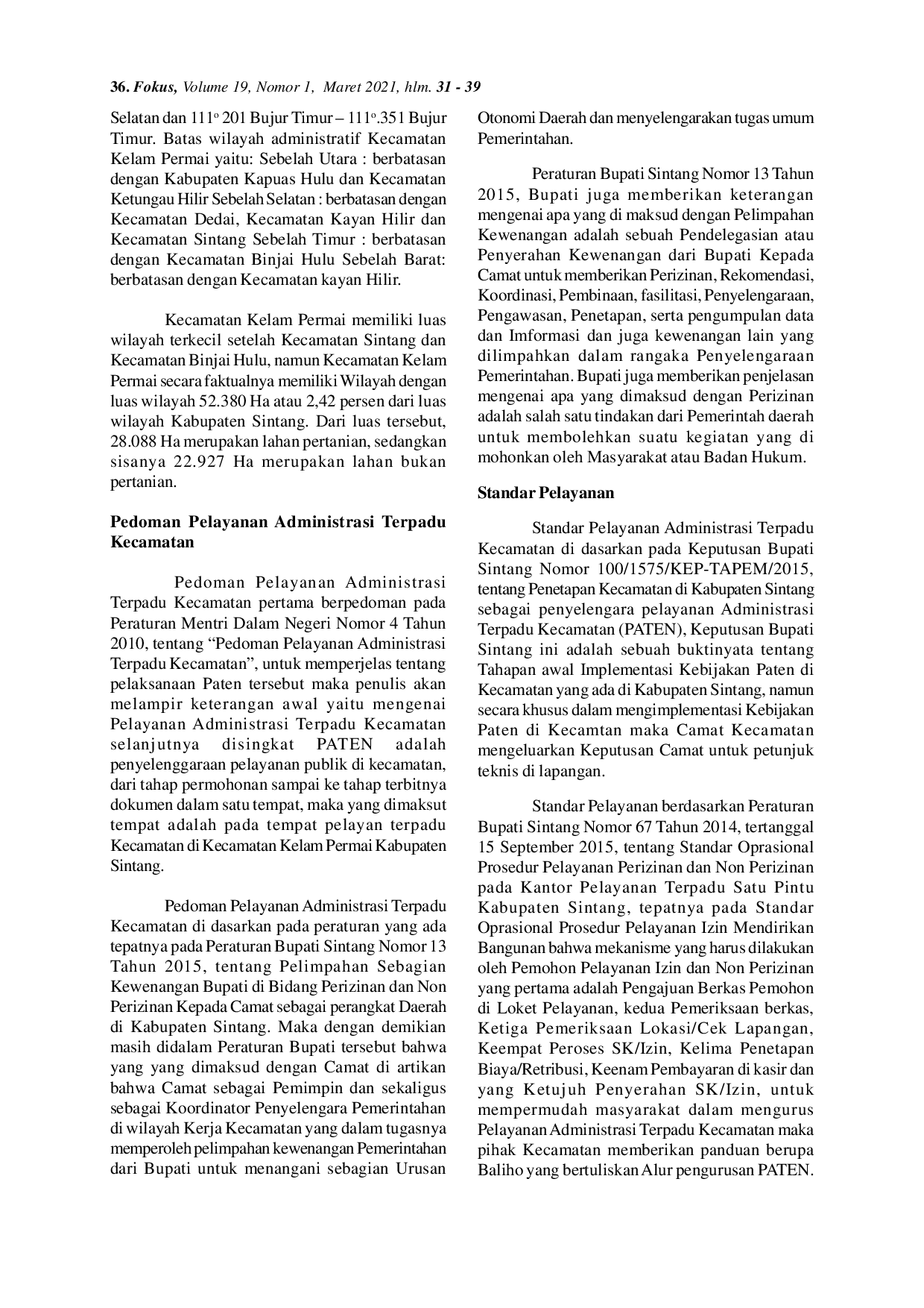 FOKUS : Publikasi Ilmiah untuk Mahasiswa, Staf Pengajar dan Alumni Universitas Kapuas SintangFOKUS : Publikasi Ilmiah untuk Mahasiswa, Staf Pengajar dan Alumni Universitas Kapuas SintangPermasalahan yang dikemukakan dalam Penelitian ini adalah . Pedoman Pelayanan Administrasi Terpadu Kecamatan Kelam Permai Kabupaten Sintang diketahui bahwa dengan keluarnya Peraturan Mentri dalam Negeri Nomor 4 Tahun 2010 tentang Pelayanan Administrasi Terpadu Kecamatan dan Keputusan Camat Kelam Permai Nomor 100/01/KEP-PELUM/2016 tentang Paten maka Kecamatan Kelam Permai bisa melaksanakan Pelayanan Administrasi Terpadu. Standar Pelayanan didasarkan pada Keputusan Bupati Sintang Nomor 67 tahun 2014 tentang Standar Oprasional Prosedur Pelayanan Perizinan dan Non Perizinan pada Kantor Pelayanan Terpadu Satu Pintu Kabupaten Sintang. Kesimpulan dalam penelitian ini adalah telah dilaksanakan sesuai dengan SOP yang dikeluarkan oleh Bupati Sintang. Saran yang harus dilakukan adalah Pemerintah Kecamatan agar meningkatkan Sumber Daya Manusia dan Sarana Prasarana penunjang lainnya.