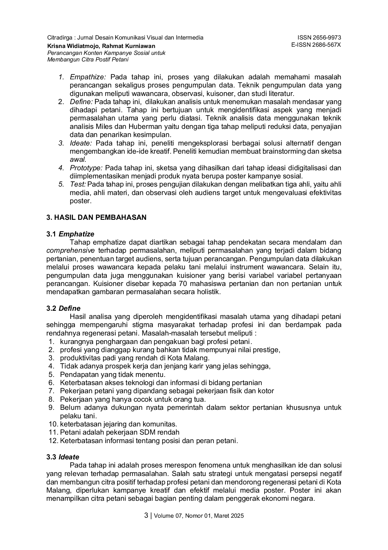 Citradirga : Jurnal Desain Komunikasi Visual dan IntermediaCitradirga : Jurnal Desain Komunikasi Visual dan IntermediaPenelitian ini berfokus pada padi di kalangan generasi muda. Persepsi ini dipengaruhi oleh stereotip tentang pertanian sebagai pekerjaan yang kotor, melelahkan, tidak menguntungkan, dan kurang bergengsi. Kampanye sosial dirancang untuk mengubah persepsi negatif, membangkitkan kesadaran, dan apresiasi terhadap profesi petani padi, serta mendorong regenerasi petani. Penelitian menggunakan pendekatan kualitatif dengan metode Design Thinking, melibatkan tahapan empati, definisi, ideasi, pembuatan prototipe, dan pengujian. Data dikumpulkan melalui wawancara dengan petani, observasi lapangan, serta studi literatur. Hasil berupa 12 poster kampanye sosial dengan teknik metafora visual untuk membangun citra positif profesi petani padi. Uji validitas oleh ahli media dan ahli materi menunjukkan poster kampanye sosial ini dapat menyampaikan pesan dan mencapai tujuan kampanye. Umpan balik audiens target juga menunjukkan tingkat penerimaan dan apresiasi yang tinggi.