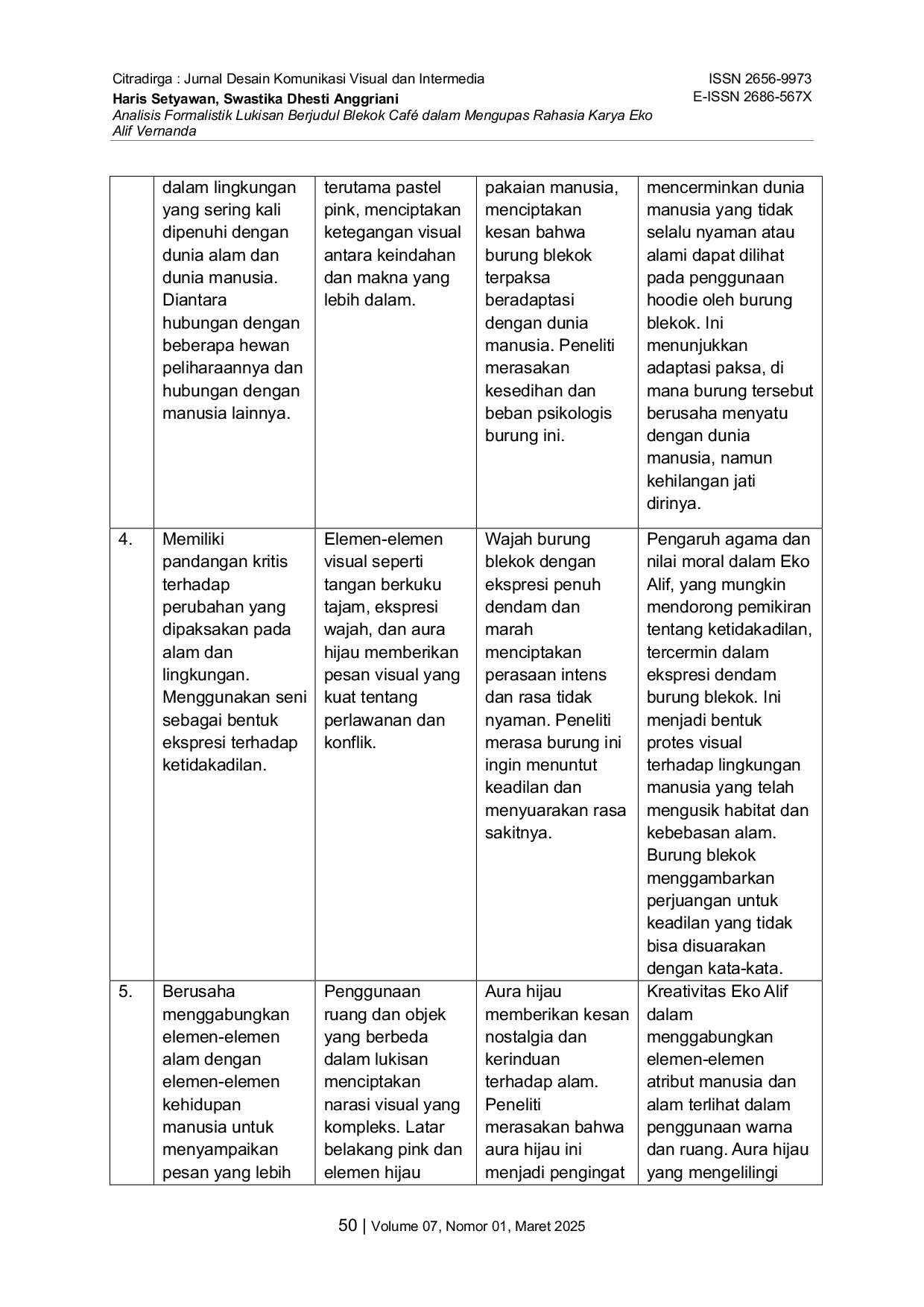 Citradirga : Jurnal Desain Komunikasi Visual dan IntermediaCitradirga : Jurnal Desain Komunikasi Visual dan IntermediaLukisan Blekok Cafe karya Eko Alif yang dibuat pada tahun 2024 dipilih sebagai objek penelitian untuk menggali pesan dan nilai-nilai yang terkandung dalam karya seni tersebut. Peneliti merasakan emosi yang kompleks dalam lukisan ini, berupa kontradiksi antara kemewahan dan kemarahan yang terkandung dalam sosok burung blekok yang tampak terasing dari habitat aslinya. Penelitian ini bertujuan untuk mengidentifikasi dan menganalisis nilai-nilai serta sintesis yang terkandung dalam karya tersebut, khususnya dalam konteks hubungan antara manusia, alam, dan makhluk hidup lainnya. Metode yang digunakan adalah kualitatif deskriptif dengan pendekatan kritik holistik. Pengumpulan data dilakukan melalui wawancara dengan seniman, observasi terhadap karya seni, serta analisis dokumen yang berkaitan dengan konteks sosial dan lingkungan. Data dikumpulkan dari tiga sumber utama: informasi genetik (dari seniman), informasi objektif (dari karya seni), dan informasi afektif (dari penghayat). Triangulasi metode digunakan untuk memvalidasi temuan-temuan yang diperoleh. Hasil penelitian menunjukkan bahwa lukisan ini menggambarkan kegelisahan Eko Alif terhadap dampak negatif aktivitas manusia terhadap alam, terutama terhadap habitat burung blekok yang terganggu. Nilai sosial yang terkandung dalam lukisan ini adalah pentingnya saling mengingatkan sesama untuk menjaga keharmonisan antara manusia, alam, dan sesama makhluk hidup. Lukisan Blekok Cafe menyampaikan pesan yang kuat tentang perlunya kesadaran akan keberadaan alam dan makhluk hidup lain yang sering kali terabaikan dalam dunia manusia yang serba materialistis.