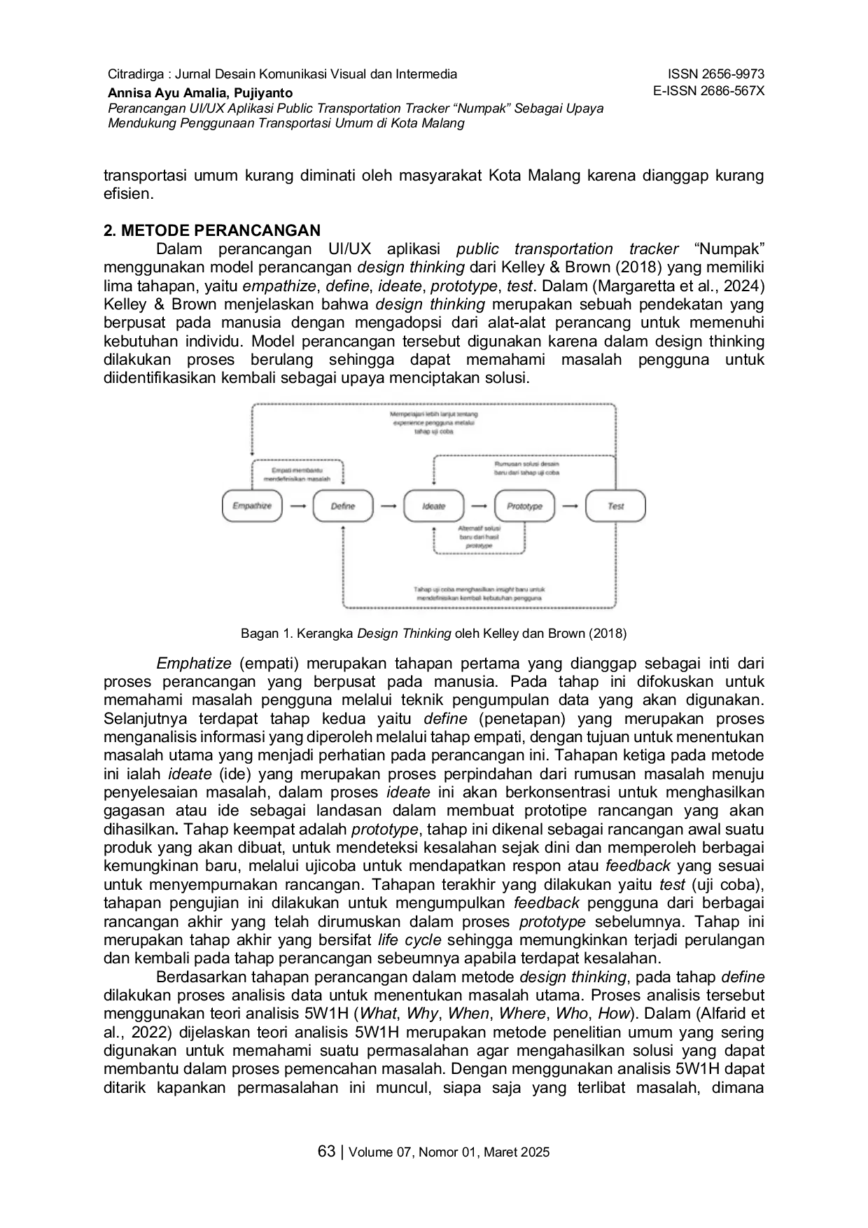Citradirga : Jurnal Desain Komunikasi Visual dan IntermediaCitradirga : Jurnal Desain Komunikasi Visual dan IntermediaKurangnya fasilitas untuk mengakses informasi menyebabkan transportasi umum di Kota Malang dinilai kurang efektif dalam memenuhi kebutuhan mobilitas masyarakat. Hal itu mengakibatkan minat masyarakat terhadap transportasi umum di Kota Malang menurun dan lebih memilih menggunakan kendaraan pribadi. Sebagai upaya mendukung penggunaan transportasi umum di Kota Malang diperlukan solusi digital yang memudahkan dalam mengakses informasi transportasi umum tersebut. Perancangan ini bertujuan untuk merancang aplikasi “Numpak sebagai alat bantu navigasi angkot dengan fitur live tracking dan informasi rute. Proses perancangan ini menggunakan metode design thinking yang meliputi empathize, define, ideate, prototype, dan test. Perancangan ini menghasilkan prototype aplikasi sebagai media utama serta beberapa media pendukung sebagai sarana promosi. Dari segi visual, hasil perancangan ini menggunakan karakter desain modern minimalis dengan tipografi sans serif dan palet warna monokrom biru dan putih, guna menciptakan tampilan yang mudah dipahami. Aplikasi ini diharapkan dapat menjadi solusi digital yang mendukung efektivitas transportasi umum di Kota Malang.