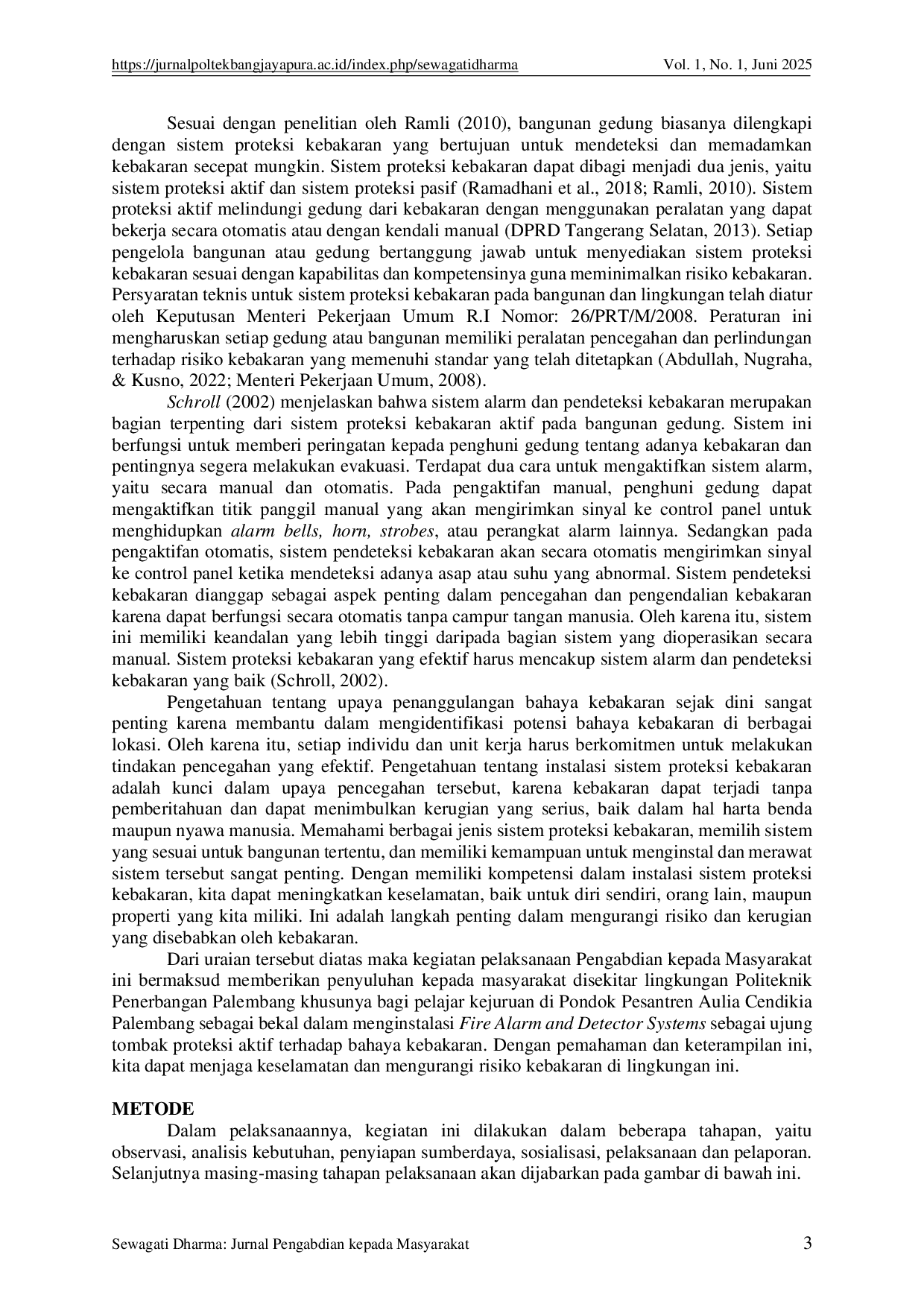 Sewagati Dharma: Jurnal Pengabdian Kepada MasyarakatSewagati Dharma: Jurnal Pengabdian Kepada MasyarakatProgram Pengabdian kepada Masyarakat bertujuan memberikan pemahaman peserta terkait sistem proteksi kebakaran, terutama instalasi Sistem Alarm dan Deteksi Kebakaran, untuk meningkatkan kesadaran dan mengurangi risiko kebakaran di sekitarnya. Program ini dilaksanakan di Pondok Pesantren Aulia Cendikia Palembang, lembaga pendidikan yang memiliki peran penting dalam membimbing generasi muda di wilayah tersebut. Program ini terdiri dari serangkaian sesi bimbingan teknis, termasuk pemaparan teori, demonstrasi praktik, dan sesi tanya jawab. Peserta terdiri dari siswa dan guru pendamping dari Pondok Pesantren Aulia Cendikia Palembang. Tim pelaksana terdiri dari Dosen, Instruktur, dan Taruna dari Program Studi Penyelamatan dan Pemadam Kebakaran program Diploma Tiga Politeknik Penerbangan Palembang. Proses pelaksanaan program mencakup pengaturan keselamatan dan kesehatan kerja (K3), sesi briefing, serta pemantauan ketat terhadap aktivitas peserta. Evaluasi kepuasan peserta dilakukan untuk mengukur respon positif terhadap program, dengan 100% peserta menyatakan persetujuan yang kuat. Namun, beberapa peserta mengusulkan perpanjangan durasi program dan peningkatan frekuensinya untuk mencakup kompetensi lain yang terkait. Saran-saran ini menjadi dasar untuk meningkatkan pelaksanaan program di masa mendatang. Program ini telah memberikan kontribusi signifikan dalam pencegahan kebakaran, memperkaya pengetahuan dan keterampilan masyarakat, dan berhasil menyediakan pelatihan yang efektif untuk mengurangi risiko kebakaran, menghasilkan dampak positif yang berkelanjutan.