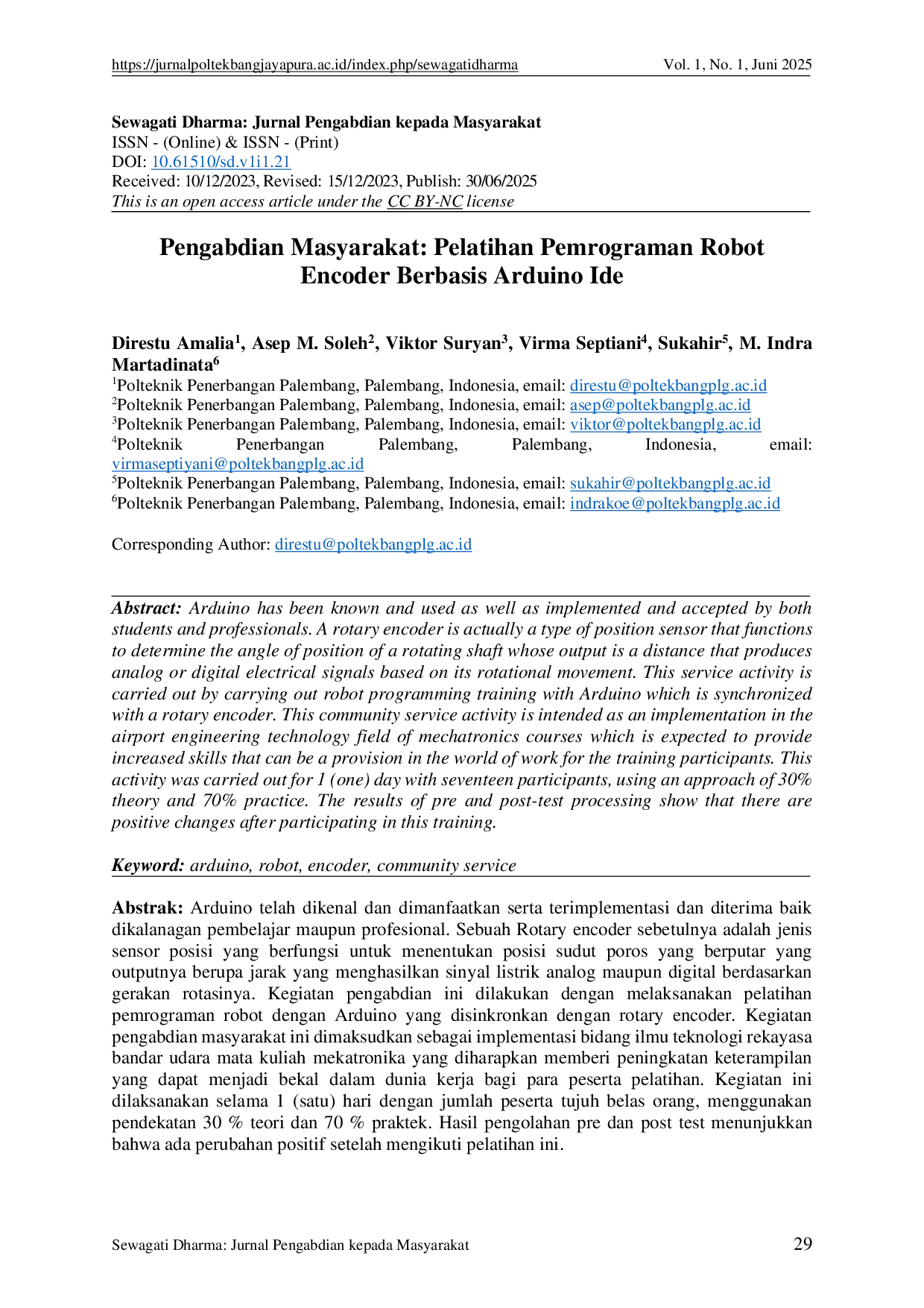 Sewagati Dharma: Jurnal Pengabdian Kepada MasyarakatSewagati Dharma: Jurnal Pengabdian Kepada MasyarakatArduino telah dikenal dan dimanfaatkan serta terimplementasi dan diterima baik dikalanagan pembelajar maupun profesional. Sebuah Rotary encoder sebetulnya adalah jenis sensor posisi yang berfungsi untuk menentukan posisi sudut poros yang berputar yang outputnya berupa jarak yang menghasilkan sinyal listrik analog maupun digital berdasarkan gerakan rotasinya. Kegiatan pengabdian ini dilakukan dengan melaksanakan pelatihan pemrograman robot dengan Arduino yang disinkronkan dengan rotary encoder. Kegiatan pengabdian masyarakat ini dimaksudkan sebagai implementasi bidang ilmu teknologi rekayasa bandar udara mata kuliah mekatronika yang diharapkan memberi peningkatan keterampilan yang dapat menjadi bekal dalam dunia kerja bagi para peserta pelatihan. Kegiatan ini dilaksanakan selama 1 (satu) hari dengan jumlah peserta tujuh belas orang, menggunakan pendekatan 30 % teori dan 70 % praktek. Hasil pengolahan pre dan post test menunjukkan bahwa ada perubahan positif setelah mengikuti pelatihan ini.