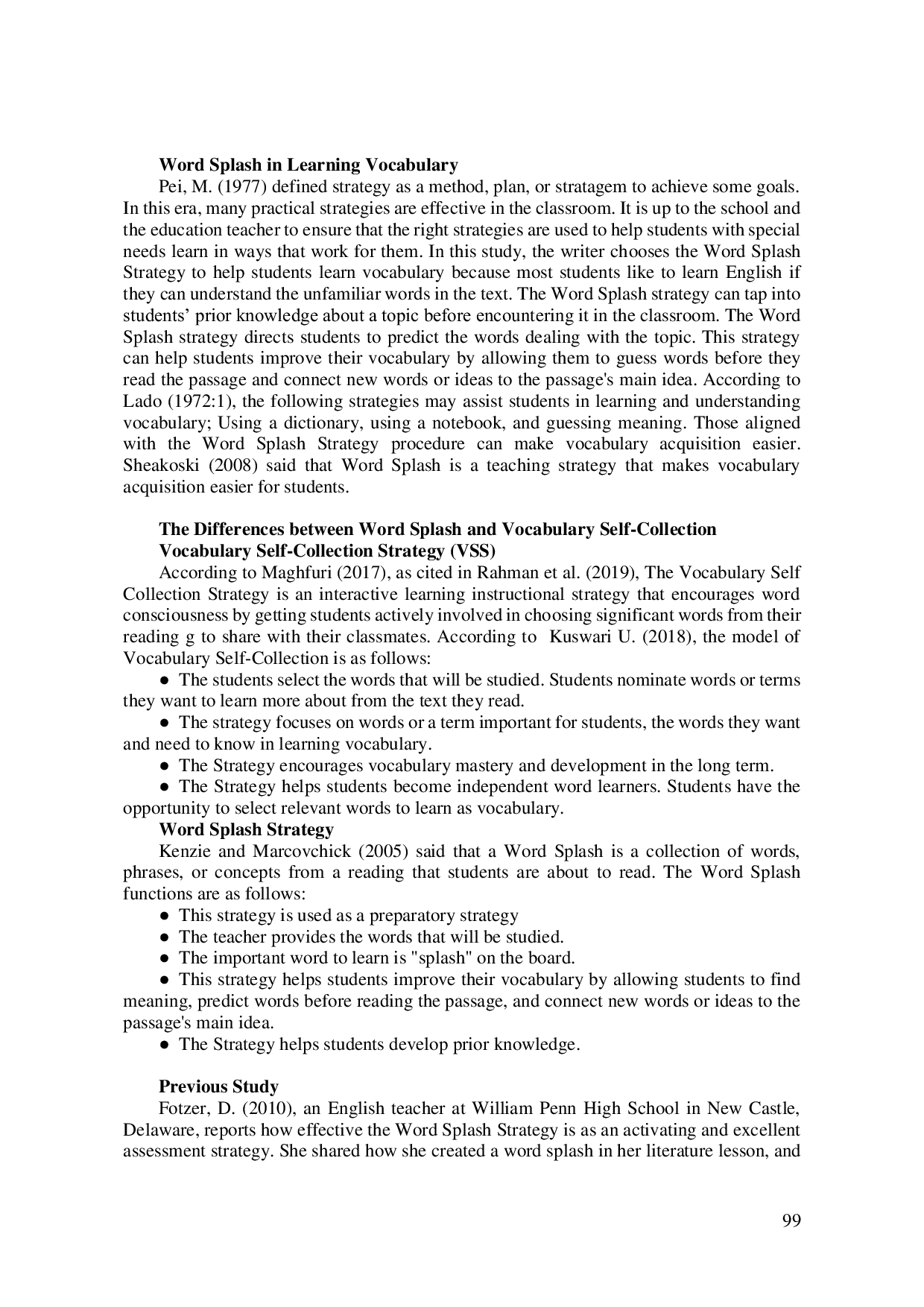 MATAI: International Journal of Language EducationMATAI: International Journal of Language EducationMakalah ini mengeksplorasi penggunaan strategi *word splash* untuk meningkatkan kosakata pada jenjang Sekolah Menengah Pertama. Beberapa peneliti telah menerapkan strategi *word splash* untuk membantu siswa mempelajari kosakata. Penelitian menunjukkan bahwa dengan menggunakan strategi *word splash*, siswa dapat termotivasi secara efektif dalam mempelajari kosakata. Siswa menunjukkan bukti pembelajaran melalui penggunaan strategi *word splash*. *Word Splash* adalah strategi pembelajaran yang merangsang pemikiran seputar suatu topik. Strategi *Word Splash* memungkinkan siswa untuk mempelajari kata-kata dan ide-ide baru sebelum mereka mulai membaca dan membantu mereka memahami bagaimana kata tersebut mungkin berhubungan. Strategi ini dapat membantu siswa meningkatkan kosakata mereka dengan memungkinkan mereka memprediksi kata-kata sebelum membaca suatu bagian teks dan menghubungkan kata-kata atau ide-ide baru dengan ide utama bagian tersebut.