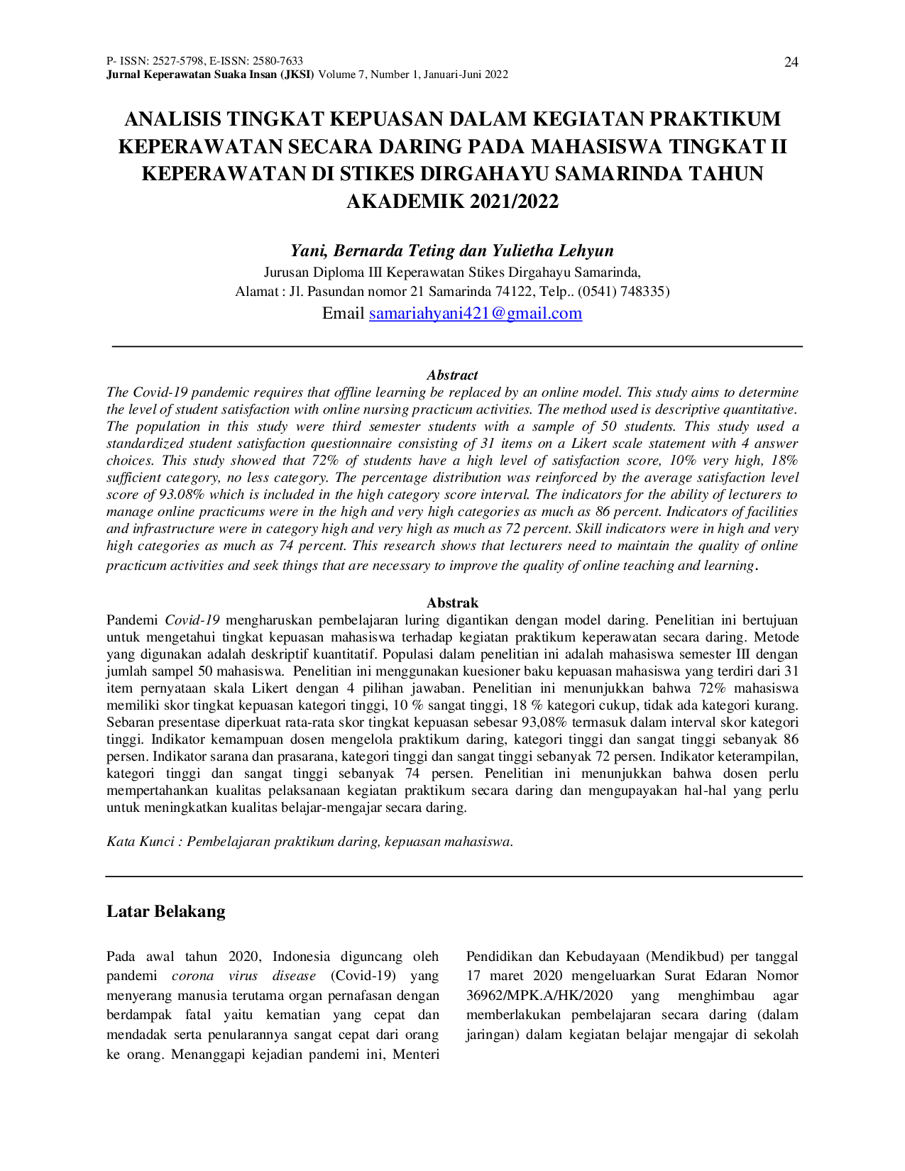 JURNAL KEPERAWATAN SUAKA INSAN (JKSI)JURNAL KEPERAWATAN SUAKA INSAN (JKSI)Pandemi Covid-19 mengharuskan pembelajaran luring digantikan dengan model daring. Penelitian ini bertujuan untuk mengetahui tingkat kepuasan mahasiswa terhadap kegiatan praktikum keperawatan secara daring. Metode yang digunakan adalah deskriptif kuantitatif. Populasi dalam penelitian ini adalah mahasiswa semester III dengan jumlah sampel 50 mahasiswa. Penelitian ini menggunakan kuesioner baku kepuasan mahasiswa yang terdiri dari 31 item pernyataan skala Likert dengan 4 pilihan jawaban. Penelitian ini menunjukkan bahwa 72% mahasiswa memiliki skor tingkat kepuasan kategori tinggi, 10 % sangat tinggi, 18 % kategori cukup, tidak ada kategori kurang.