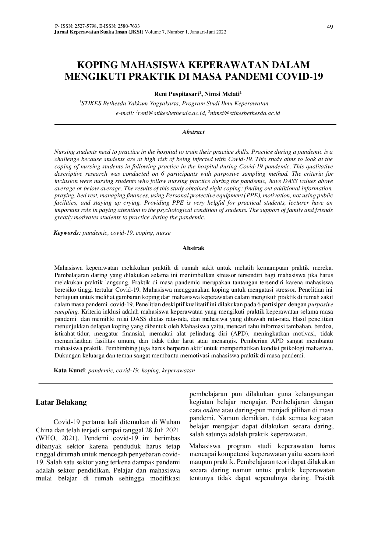 JURNAL KEPERAWATAN SUAKA INSAN (JKSI)JURNAL KEPERAWATAN SUAKA INSAN (JKSI)Mahasiswa keperawatan melakukan praktik di rumah sakit untuk melatih kemampuan praktik mereka. Pembelajaran daring yang dilakukan selama ini menimbulkan stressor tersendiri bagi mahasiswa jika harus melakukan praktik langsung. Praktik di masa pandemic merupakan tantangan tersendiri karena mahasiswa beresiko tinggi tertular Covid-19. Mahasiswa menggunakan koping untuk mengatasi stressor. Penelitian ini bertujuan untuk melihat gambaran koping dari mahasiswa keperawatan dalam mengikuti praktik di rumah sakit dalam masa pandemi covid-19. Penelitian deskriptif kualitatif ini dilakukan pada 6 partisipan dengan purposive sampling. Kriteria inklusi adalah mahasiswa keperawatan yang mengikuti praktik keperawatan selama masa pandemi dan memiliki nilai DASS diatas rata-rata, dan mahasiwa yang dibawah rata-rata. Hasil penelitian menunjukkan delapan koping yang dibentuk oleh Mahasiswa yaitu, mencari tahu informasi tambahan, berdoa, istirahat-tidur, mengatur finansial, memakai alat pelindung diri (APD), meningkatkan motivasi, tidak memanfaatkan fasilitas umum, dan tidak tidur larut atau menangis. Pemberian APD sangat membantu mahasiswa praktik. Pembimbing juga harus berperan aktif untuk memperhatikan kondisi psikologi mahasiwa. Dukungan keluarga dan teman sangat membantu memotivasi mahasiswa praktik di masa pandemi.