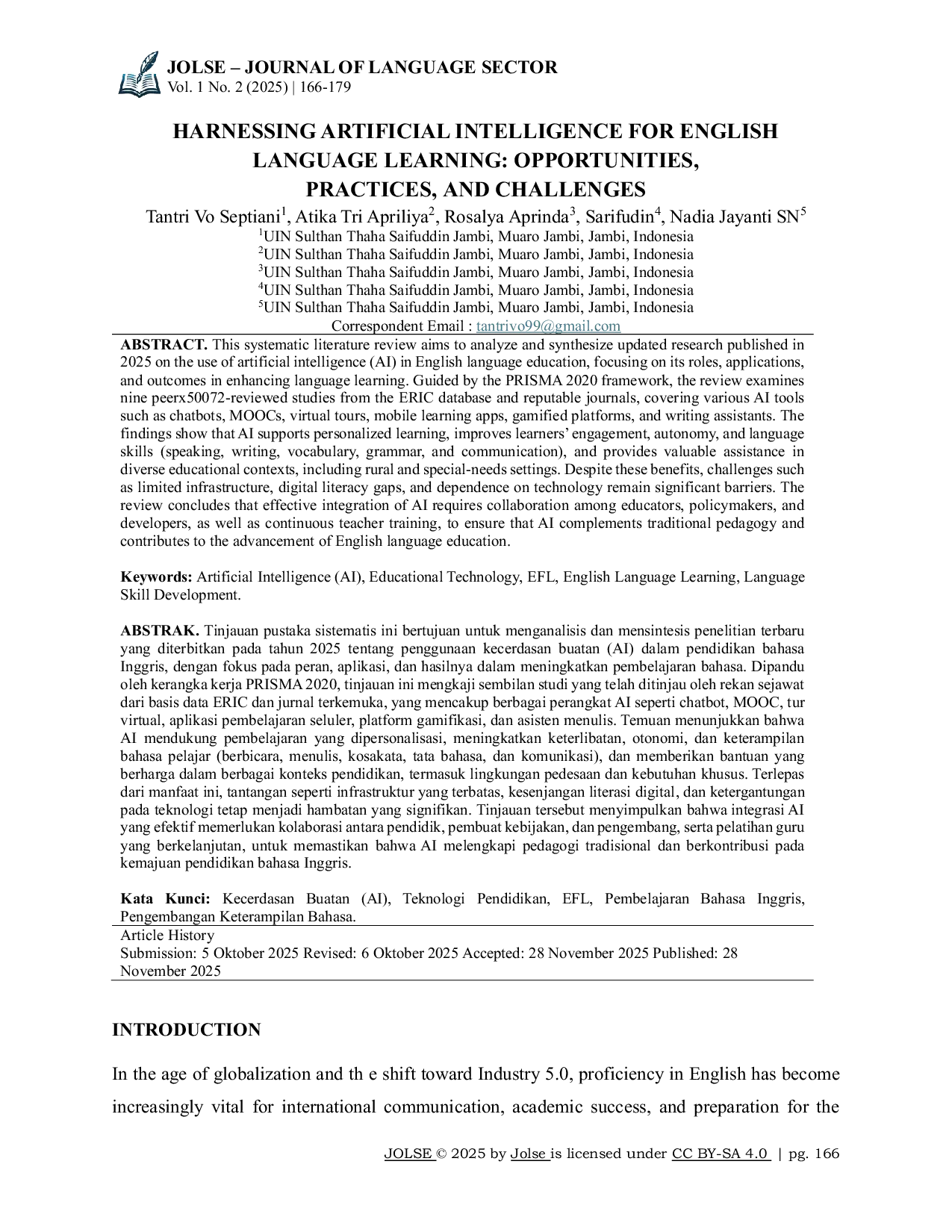 Journal of Language SectorJournal of Language SectorTinjauan pustaka sistematis ini bertujuan untuk menganalisis dan mensintesis penelitian terbaru yang diterbitkan pada tahun 2025 tentang penggunaan kecerdasan buatan (AI) dalam pendidikan bahasa Inggris, dengan fokus pada peran, aplikasi, dan hasilnya dalam meningkatkan pembelajaran bahasa. Dipandu oleh kerangka kerja PRISMA 2020, tinjauan ini mengkaji sembilan studi yang telah ditinjau oleh rekan sejawat dari basis data ERIC dan jurnal terkemuka, yang mencakup berbagai perangkat AI seperti chatbot, MOOC, tur virtual, aplikasi pembelajaran seluler, platform gamifikasi, dan asisten menulis. Temuan menunjukkan bahwa AI mendukung pembelajaran yang dipersonalisasi, meningkatkan keterlibatan, otonomi, dan keterampilan bahasa pelajar (berbicara, menulis, kosakata, tata bahasa, dan komunikasi), dan memberikan bantuan yang berharga dalam berbagai konteks pendidikan, termasuk lingkungan pedesaan dan kebutuhan khusus. Terlepas dari manfaat ini, tantangan seperti infrastruktur yang terbatas, kesenjangan literasi digital, dan ketergantungan pada teknologi tetap menjadi hambatan yang signifikan. Tinjauan tersebut menyimpulkan bahwa integrasi AI yang efektif memerlukan kolaborasi antara pendidik, pembuat kebijakan, dan pengembang, serta pelatihan guru yang berkelanjutan, untuk memastikan bahwa AI melengkapi pedagogi tradisional dan berkontribusi pada kemajuan pendidikan bahasa Inggris.