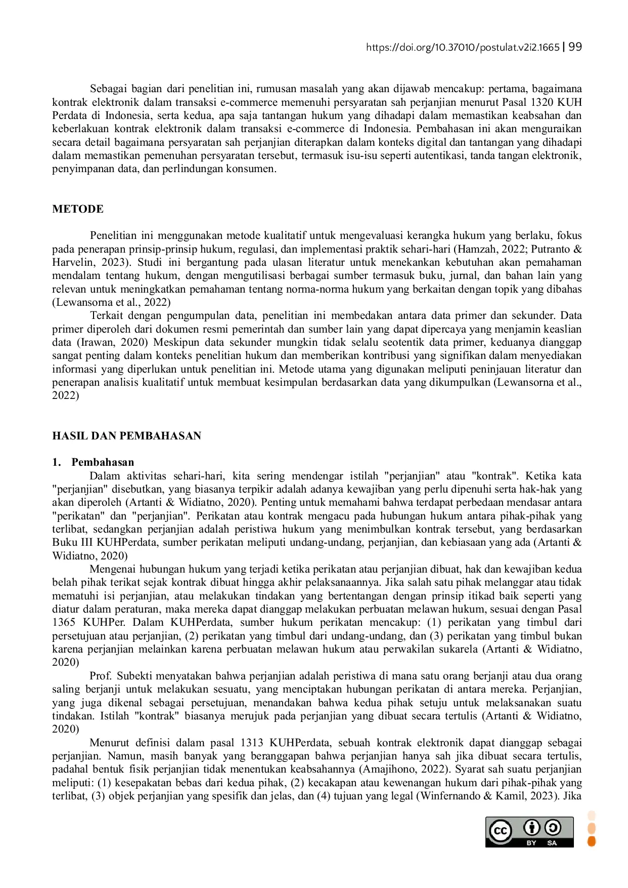 POSTULATPOSTULATPerkembangan era digital yang cepat telah mengubah perilaku masyarakat secara signifikan, khususnya dalam cara melakukan transaksi di Indonesia. Seiring dengan penetrasi kemajuan teknologi dalam berbagai aspek kehidupan, terdapat ketergantungan yang meningkat terhadap kontrak elektronik, terutama dalam e-commerce. Studi ini mengeksplorasi standar hukum dan aplikasi praktis dari kontrak elektronik di Indonesia, menelusuri bagaimana mereka memenuhi syarat kontrak tradisional seperti kesepakatan bersama, kapasitas, objek yang spesifik, dan tujuan yang sah sebagaimana diuraikan dalam Pasal 1320 KUH Perdata. Penelitian menggunakan metodologi kualitatif, berfokus pada tinjauan literatur yang komprehensif untuk memahami kerangka hukum yang ada dan bagaimana mereka diterapkan pada transaksi elektronik. Analisis bertujuan untuk menjembatani prinsip teoretis dengan aplikasi dunia nyata, mengambil dari sumber primer dan sekunder untuk memperkaya temuan penelitian. Hasil menunjukkan bahwa meskipun kontrak elektronik memfasilitasi efisiensi dan aksesibilitas yang lebih luas dalam transaksi, masih terdapat kompleksitas dalam memastikan keabsahan dan keberlakuan mereka, terutama terkait prinsip itikad baik dan kapasitas kontraktual. Penafsiran hukum yang signifikan masih cenderung ke arah kebutuhan perjanjian tertulis meskipun penerimaan hukum terhadap format elektronik sebagai perjanjian yang mengikat di bawah hukum Indonesia. Studi lebih lanjut mengamati disparitas dalam pengakuan hukum dan aplikasi praktis kontrak elektronik, menyarankan kebutuhan akan regulasi yang lebih jelas dan perlindungan konsumen yang lebih kuat di pasar digital.