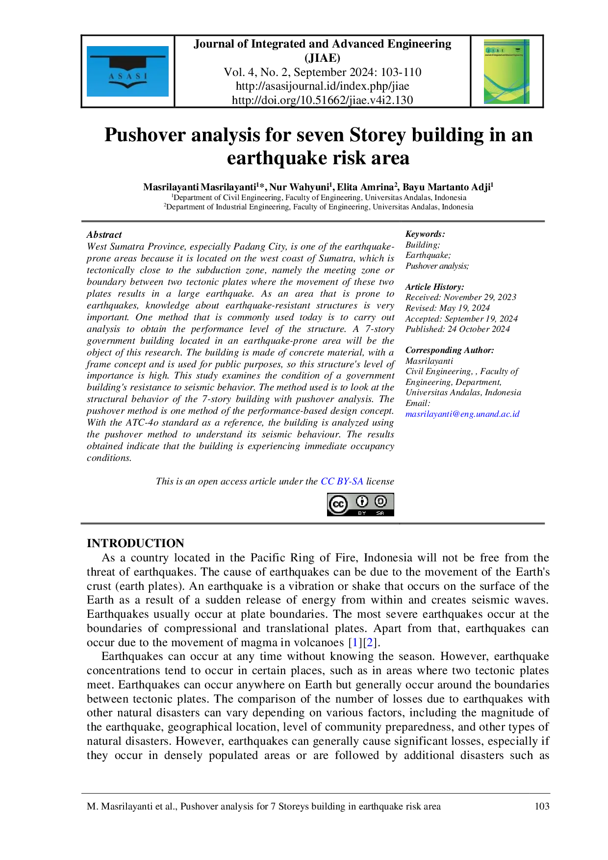 Journal of Integrated and Advanced Engineering (JIAE)Journal of Integrated and Advanced Engineering (JIAE)West Sumatra Province, especially Padang City, is one of the earthquake-prone areas because it is located on the west coast of Sumatra, which is tectonically close to the subduction zone. As an area that is prone to earthquakes, knowledge about earthquake-resistant structures is very important. This study examines the condition of a government buildings resistance to seismic behavior using pushover analysis, a method of performance-based design. The analysis, conducted with the ATC-40 standard, indicates that the building is experiencing immediate occupancy conditions.