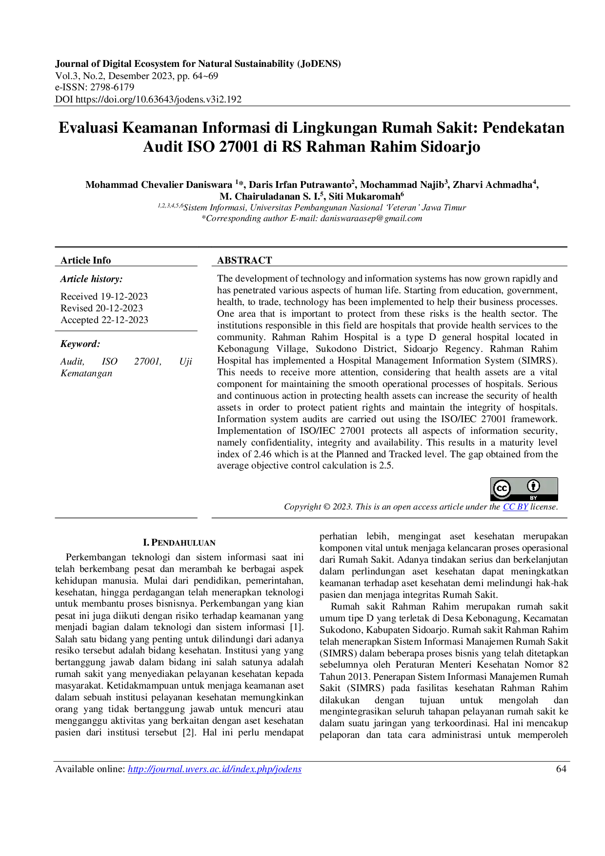 Journal of Digital Ecosystem for Natural SustainabilityJournal of Digital Ecosystem for Natural SustainabilityPerkembangan teknologi dan sistem informasi kini berkembang pesat dan telah merambah ke berbagai aspek kehidupan manusia. Mulai dari pendidikan, pemerintahan, kesehatan, hingga perdagangan, teknologi telah diterapkan untuk mendukung proses bisnis masing‑masing. Salah satu bidang yang penting untuk dilindungi dari risiko tersebut adalah sektor kesehatan. Institusi yang bertanggung jawab dalam bidang ini adalah rumah sakit yang menyediakan layanan kesehatan kepada masyarakat. Rumah Sakit Rahman Rahim merupakan rumah sakit umum tipe D yang berlokasi di Desa Kebonagung, Kecamatan Sukodono, Kabupaten Sidoarjo. Rumah Sakit Rahman Rahim telah mengimplementasikan Sistem Informasi Manajemen Rumah Sakit (SIMRS). Hal ini memerlukan perhatian lebih, mengingat aset kesehatan merupakan komponen vital untuk menjaga kelancaran proses operasional rumah sakit. Upaya yang serius dan berkelanjutan dalam melindungi aset kesehatan dapat meningkatkan keamanan aset tersebut guna melindungi hak pasien dan menjaga integritas rumah sakit. Audit sistem informasi dilakukan dengan menggunakan kerangka kerja ISO/IEC 27001. Implementasi ISO/IEC 27001 melindungi seluruh aspek keamanan informasi, yaitu kerahasiaan, integritas, dan ketersediaan. Hasilnya menunjukkan indeks tingkat kematangan sebesar 2,46 yang berada pada level Planned and Tracked. Selisih yang diperoleh dari perhitungan rata‑rata kontrol objektif sebesar 2,5.