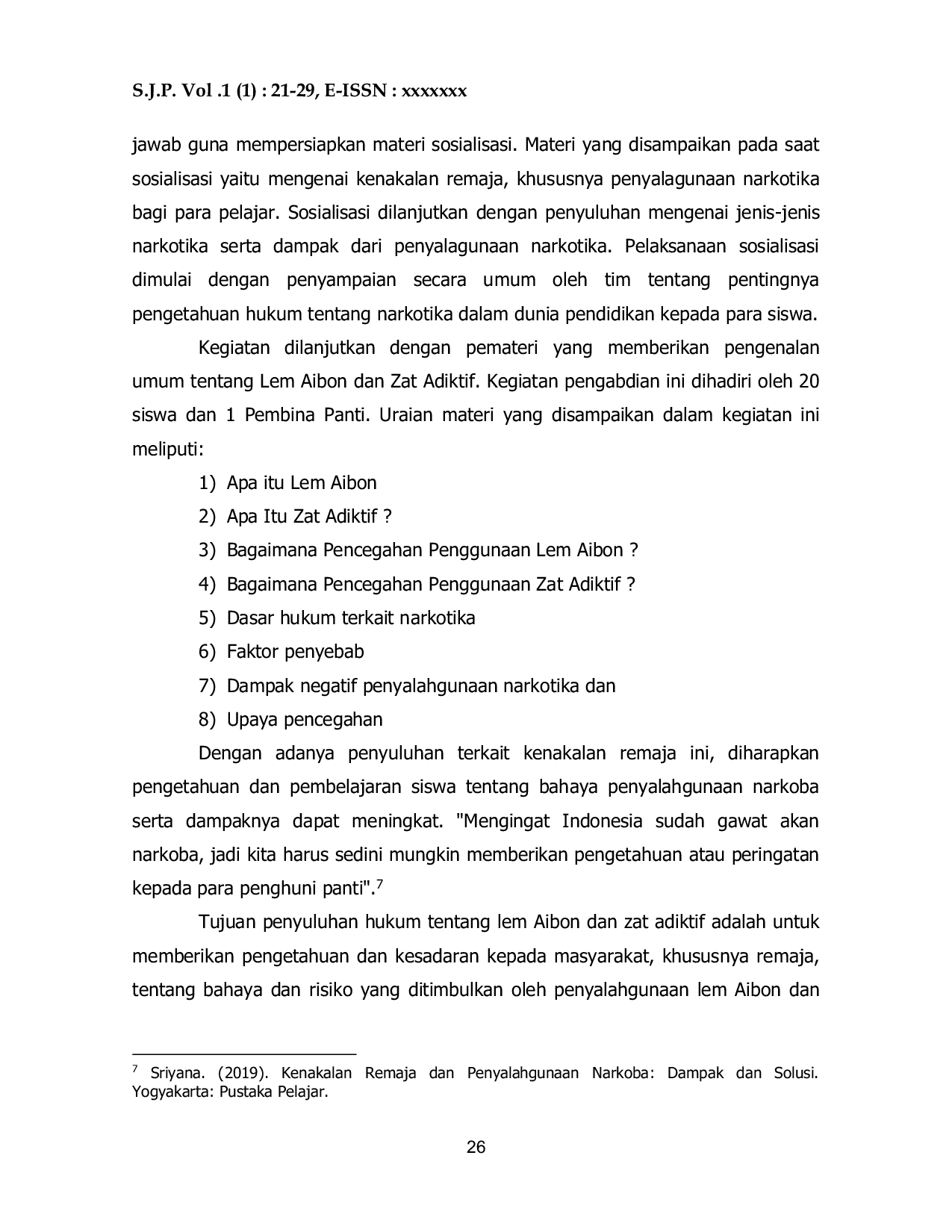 Penelitian lanjutan dapat fokus pada analisis faktor psikologis yang mendorong remaja mencoba zat adiktif, kajian perbandingan efektivitas model edukasi anti-narkoba di berbagai wilayah Indonesia, serta evaluasi jangka panjang efek sosialisasi hukum terhadap perilaku penggunaan narkoba pada kelompok rentan. Kajian tentang pengaruh faktor ekonomi dan struktur keluarga terhadap kecenderungan penyalahgunaan zat adiktif juga perlu dilakukan. Penelitian multidisiplin yang melibatkan bidang psikologi, sosiologi, dan kesehatan masyarakat dapat menyediakan perspektif terpadu untuk perencanaan program pencegahan yang lebih efektif.
