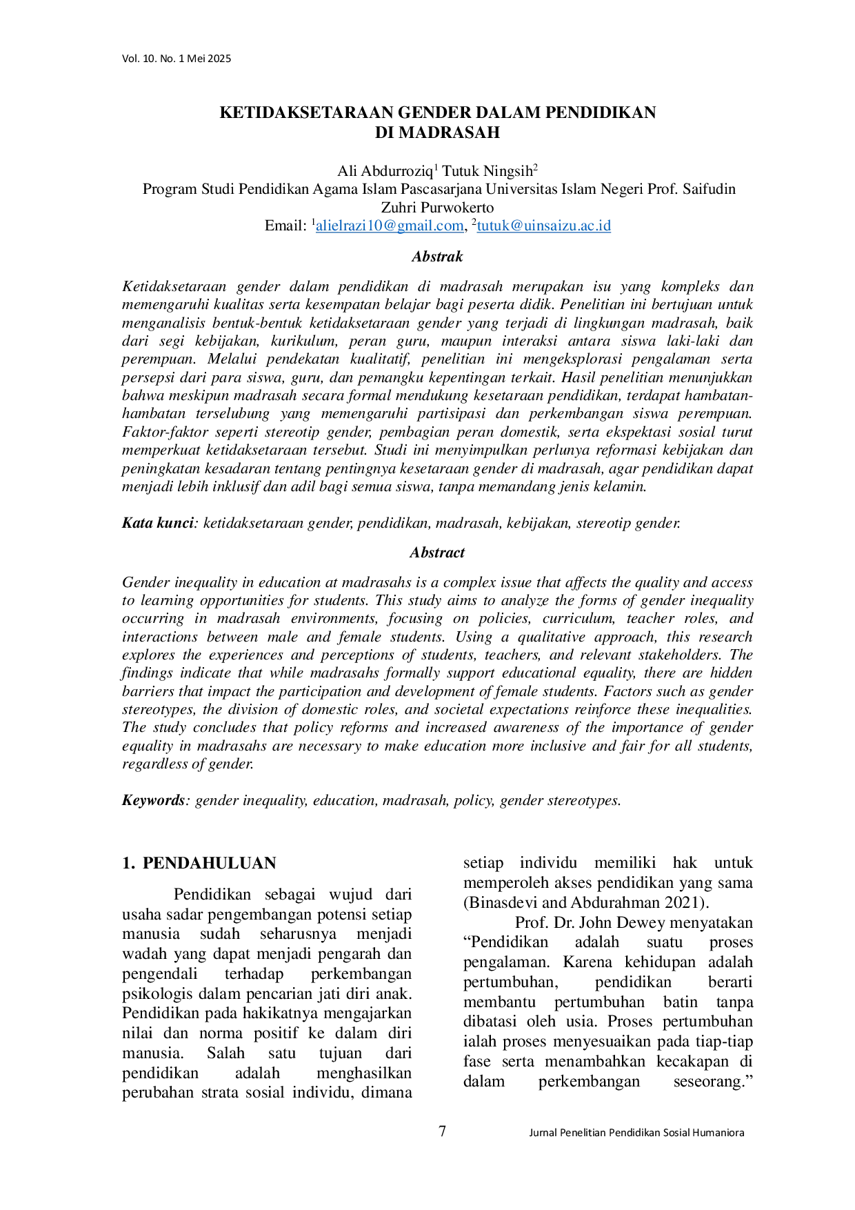 JURNAL PENELITIAN PENDIDIKAN SOSIAL HUMANIORAJURNAL PENELITIAN PENDIDIKAN SOSIAL HUMANIORAmerupakan isu yang kompleks dan memengaruhi kualitas serta kesempatan belajar bagi peserta didik. Penelitian ini bertujuan untuk menganalisis bentuk-bentuk ketidaksetaraan gender yang terjadi di lingkungan madrasah, baik dari segi kebijakan, kurikulum, peran guru, maupun interaksi antara siswa laki-laki dan perempuan. Melalui pendekatan kualitatif, penelitian ini mengeksplorasi pengalaman serta persepsi dari para siswa, guru, dan pemangku kepentingan terkait. Hasil penelitian menunjukkan bahwa meskipun madrasah secara formal mendukung kesetaraan pendidikan, terdapat hambatan-hambatan terselubung yang memengaruhi partisipasi dan perkembangan siswa perempuan. Faktor-faktor seperti stereotip gender, pembagian peran domestik, serta ekspektasi sosial turut memperkuat ketidaksetaraan tersebut. Studi ini menyimpulkan perlunya reformasi kebijakan dan peningkatan kesadaran tentang pentingnya kesetaraan gender di madrasah, agar pendidikan dapat menjadi lebih inklusif dan adil bagi semua siswa, tanpa memandang jenis kelamin.