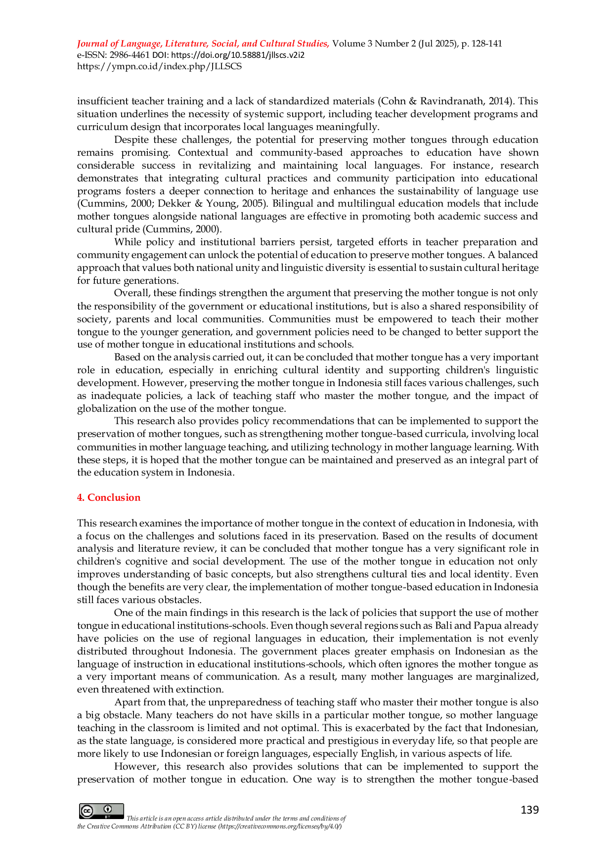 Journal of Language, Literature, Social and Cultural StudiesJournal of Language, Literature, Social and Cultural StudiesPemeliharaan bahasa ibu semakin penting dalam memahami dinamika hubungan bahasa dengan identitas budaya, kognisi, dan masyarakat. Bahasa ibu, sebagai bahasa pertama yang dipelajari sejak bayi, tidak hanya mempengaruhi cara individu berkomunikasi, tetapi juga membentuk cara mereka berpikir dan melihat dunia. Dalam konteks globalisasi yang semakin mempercepat perkembangan bahasa internasional, kritis untuk mengevaluasi bagaimana bahasa ibu tetap memainkan peran penting dalam pendidikan dan pemeliharaan identitas budaya. Penelitian ini bertujuan untuk memeriksa berpikir kritis tentang keberadaan dan pentingnya bahasa ibu dalam pendidikan dan keberlanjutan budaya, menggunakan pendekatan studi dokumen.