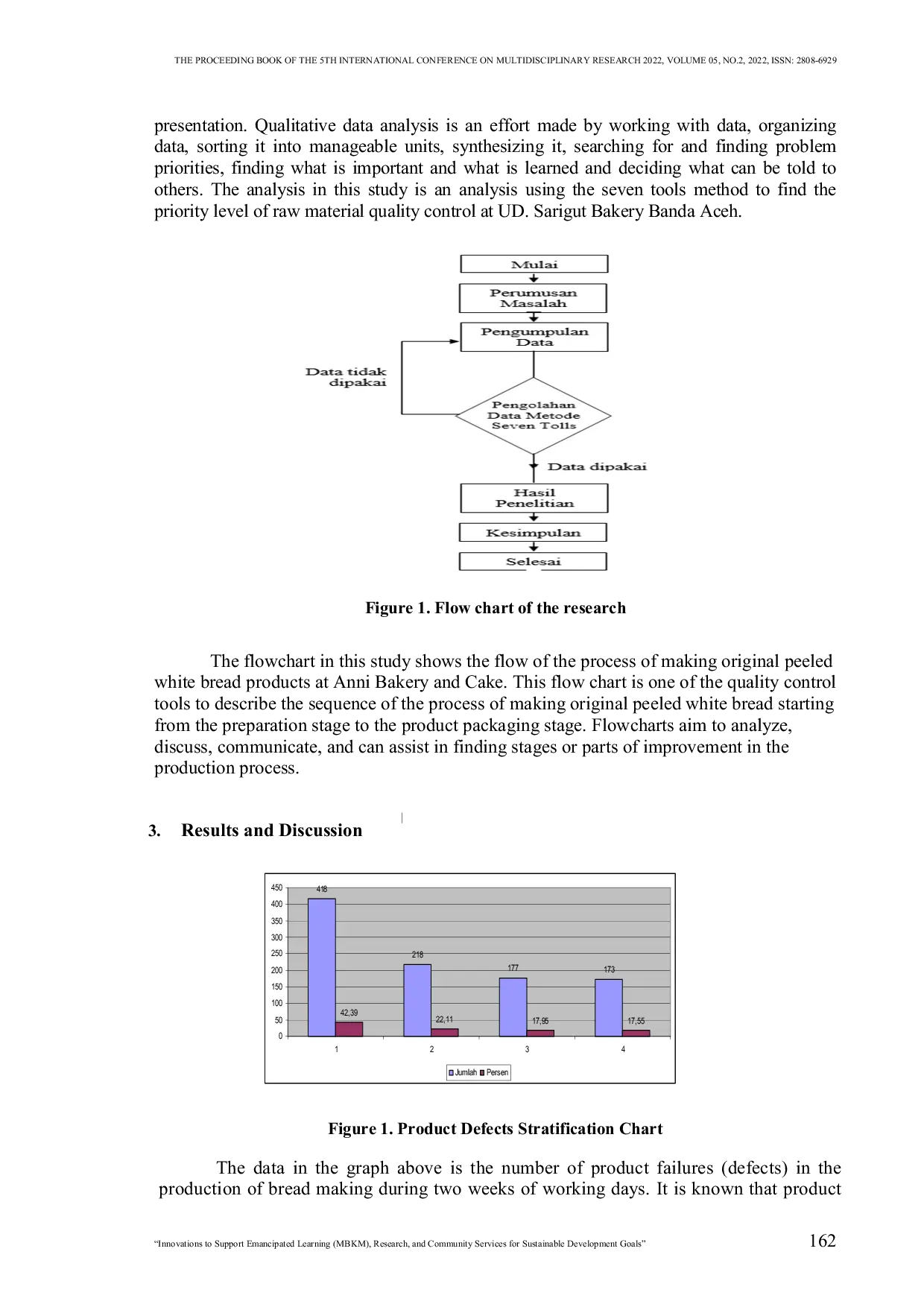 Proceedings of International Conference on Multidiciplinary ResearchProceedings of International Conference on Multidiciplinary ResearchKualitas produk merupakan faktor penting yang memengaruhi tingkat perkembangan dan kemajuan perusahaan. Perusahaan yang beroperasi tanpa memperhatikan kualitas produknya setara dengan kehilangan harapan masa depan. Hasil produk harus selalu diperiksa kepatuhannya terhadap standar yang ditetapkan agar kerusakan pada produk dapat dikurangi dan dihilangkan. Penelitian ini bertujuan menganalisis pengendalian kualitas bahan baku menggunakan metode tujuh alat pada produk roti manis UD. Sarigut Bakery Banda Aceh. Data penelitian diperoleh melalui pertanyaan yang diajukan peneliti ke sumber asli dan observasi langsung di lokasi. Hasil penelitian menemukan bahwa pengendalian kualitas bahan baku dan pendukung belum memadai karena perusahaan tidak mampu mempertahankan standar kualitas dan merek bahan, sehingga banyak menggunakan bahan non-standar dengan tingkat kualitas rendah. Namun, penataan dan kebersihan gudang serta pabrik secara umum baik. Kerusakan akibat jam kerja sebesar 13,36%, kerusakan dari simpan bahan baku 72,54%, dan kerusakan akibat penggunaan tepung terigu non-standar 86,21%. Faktor terbesar mengakibatkan kerusakan produk adalah penggunaan bahan substitusi yang tidak memenuhi standar, sehingga kadar air roti tinggi.
