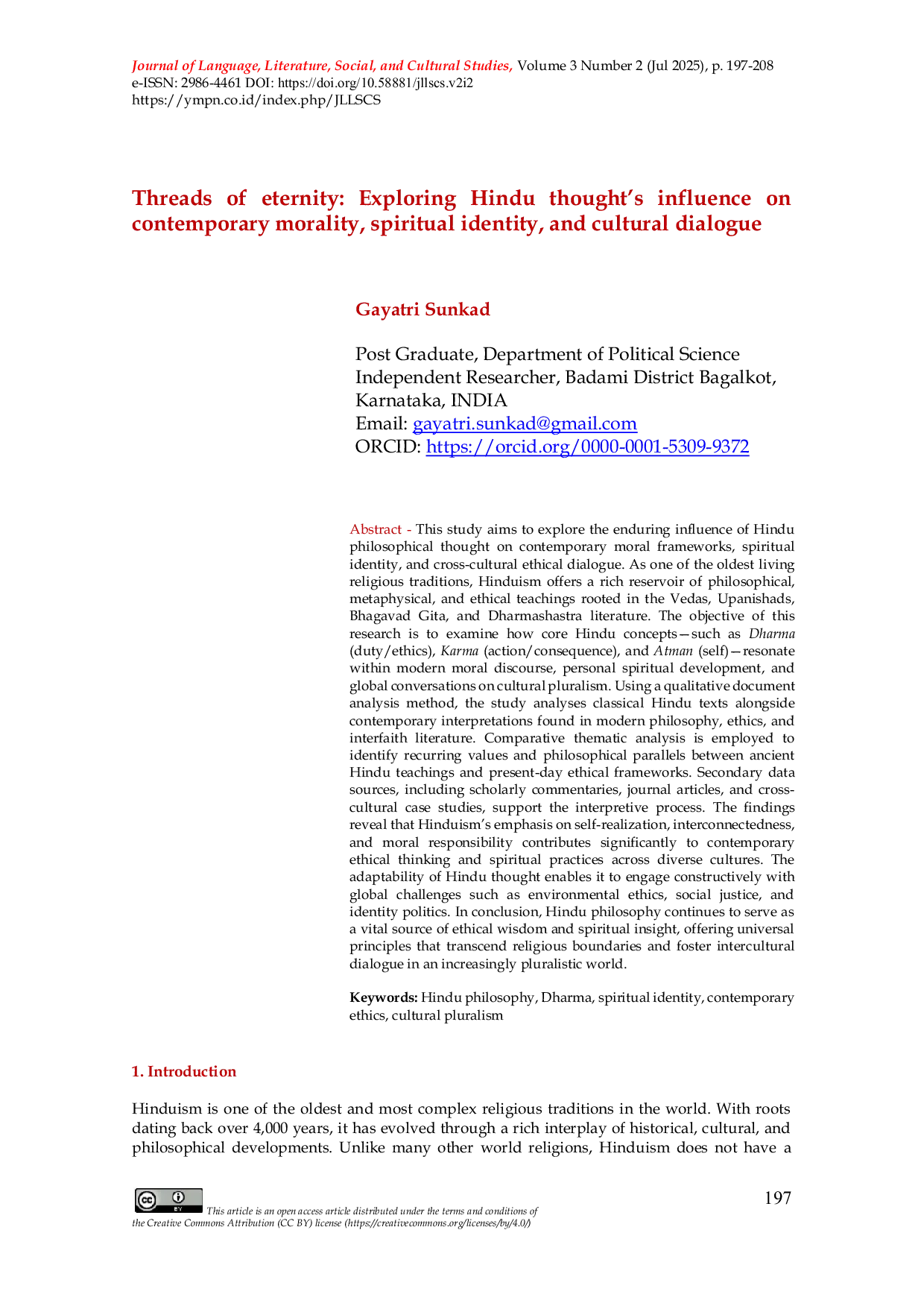 Journal of Language, Literature, Social and Cultural StudiesJournal of Language, Literature, Social and Cultural StudiesPenelitian ini bertujuan untuk mengeksplorasi pengaruh berkelanjutan dari pemikiran filsafat Hindu terhadap kerangka moral kontemporer, identitas spiritual, dan dialog etis lintas budaya. Sebagai salah satu tradisi agama tertua yang masih hidup, Hinduisme menawarkan reservoir kaya dari ajaran filosofis, metafisika, dan etika yang berakar pada Veda, Upanishad, Bhagavad Gita, dan karya-karya Dharmashastra. Penelitian ini mengeksaminasi bagaimana konsep-konsep inti Hindu seperti Dharma (kewajiban/etika), Karma (tindakan/dampak), dan Atman (diri) beresonansi dalam diskursus moral modern, pengembangan spiritual pribadi, dan percakapan global tentang pluralisme budaya. Menggunakan metode analisis dokumen kualitatif, studi ini menganalisis teks-teks Hindu klasik bersama dengan interpretasi kontemporer dalam filsafat modern, etika, dan literatur lintas agama. Analisis tematik komparatif digunakan untuk mengidentifikasi nilai-nilai berulang dan paralel filosofis antara ajaran Hindu kuno dan kerangka etika kontemporer. Sumber data sekunder seperti komentar akademis, artikel jurnal, dan studi kasus lintas budaya mendukung proses interpretasi. Temuan menunjukkan bahwa penekanan Hinduisme pada pencerahan diri, keterhubungan, dan tanggung jawab moral memberikan kontribusi signifikan terhadap pemikiran etis kontemporer dan praktik spiritual di berbagai budaya. Adaptabilitas pemikiran Hindu memungkinkannya untuk berinteraksi secara konstruktif dengan tantangan global seperti etika lingkungan, keadilan sosial, dan politik identitas. Kesimpulannya, filsafat Hindu terus menjadi sumber penting dari kebijaksanaan etis dan wawasan spiritual, menawarkan prinsip universal yang melampaui batas agama dan memupuk dialog lintas budaya dalam dunia yang semakin plural.