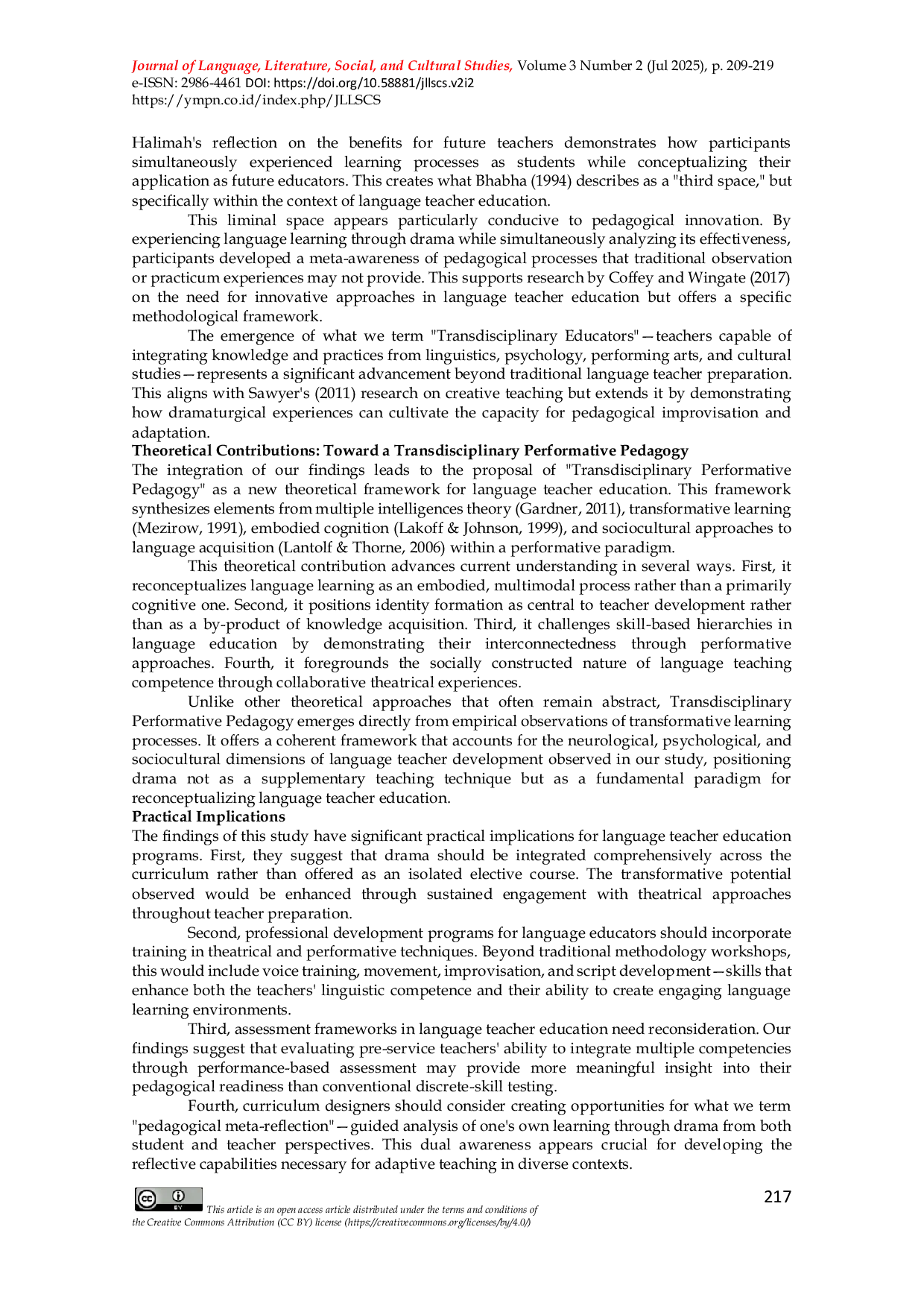 Journal of Language, Literature, Social and Cultural StudiesJournal of Language, Literature, Social and Cultural StudiesPenelitian ini bertujuan untuk menganalisis dampak pendekatan dramaturgis terhadap pengembangan kompetensi linguistik, identitas profesional, dan kreativitas pedagogis calon guru bahasa Inggris. Menggunakan desain studi kasus longitudinal dengan pendekatan campuran, penelitian ini melibatkan dua calon guru selama satu semester akademik. Data dikumpulkan melalui rubrik penilaian untuk naskah drama dan video, wawancara mendalam, dan observasi partisipan, dengan analisis yang menggunakan statistik deskriptif dan tematik. Hasil penelitian menunjukkan peningkatan signifikan dalam keterampilan linguistik dan performatif, dengan skor meningkat dari penulisan naskah hingga produksi video (15 menjadi 18 dan 13 menjadi 20). Analisis kualitatif mengidentifikasi lima fenomena kunci: Neuroplastisitas Linguistik Multimodal, Rekonfigurasi Identitas Profesional melalui Performativitas, Dekonstruksi Hierarki Keterampilan Bahasa, Teater sebagai Simulator Realitas Sosiolinguistik, dan Liminalitas Pedagogis. Temuan ini secara kolektif meletakkan dasar untuk konsep Transdisciplinary Performative Pedagogy, menawarkan paradigma baru dalam pendidikan guru bahasa Inggris.