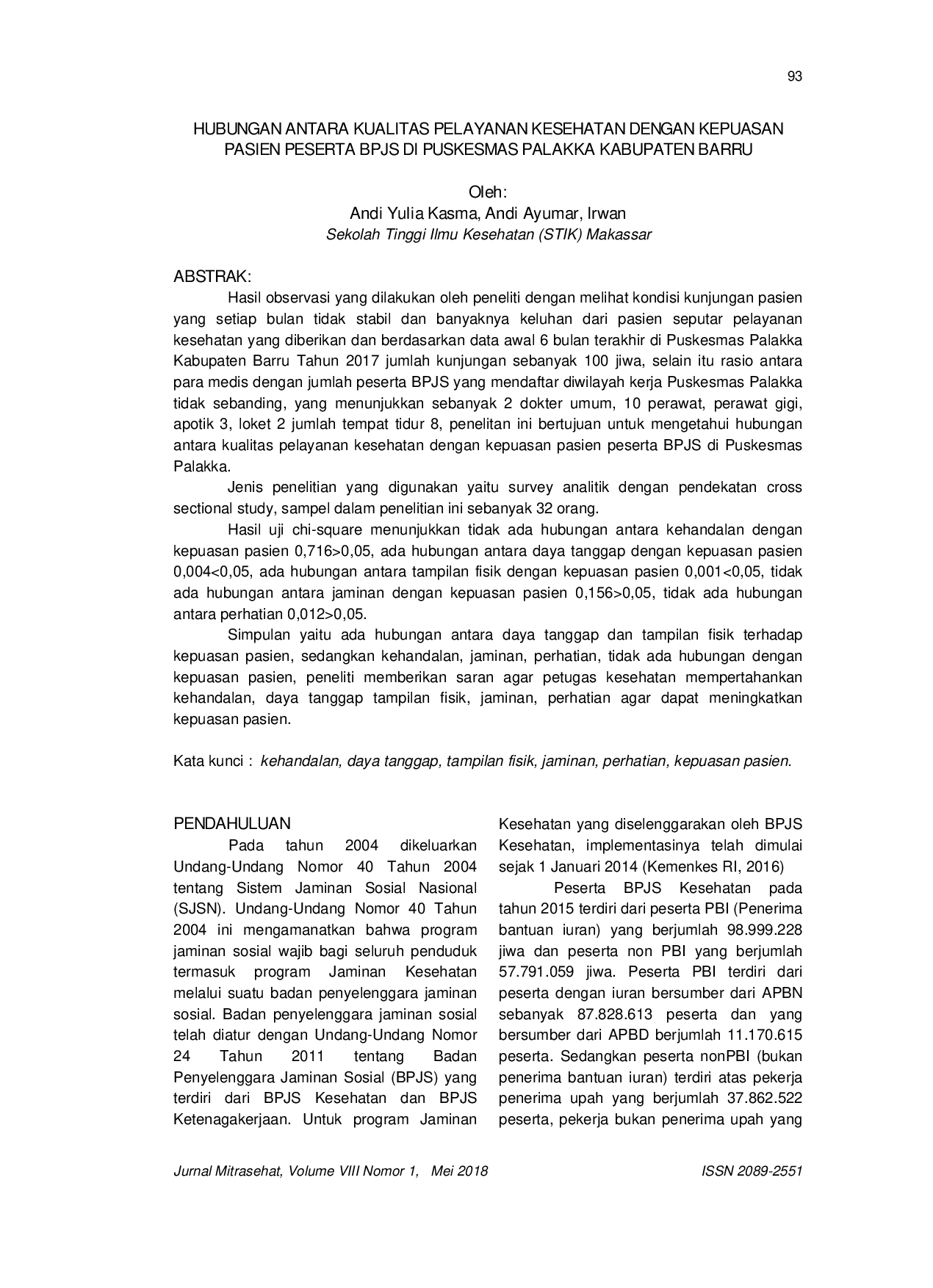 Jurnal MitrasehatJurnal MitrasehatHasil observasi yang dilakukan oleh peneliti dengan melihat kondisi kunjungan pasien yang setiap bulan tidak stabil dan banyaknya keluhan dari pasien seputar pelayanan kesehatan yang diberikan dan berdasarkan data awal 6 bulan terakhir di Puskesmas Palakka Kabupaten Barru Tahun 2017 jumlah kunjungan sebanyak 100 jiwa, selain itu rasio antara para medis dengan jumlah peserta BPJS yang mendaftar di wilayah kerja Puskesmas Palakka tidak sebanding, yang menunjukkan sebanyak 2 dokter umum, 10 perawat, perawat gigi, apotik 3, loket 2 jumlah tempat tidur 8, penelitan ini bertujuan untuk mengetahui hubungan antara kualitas pelayanan kesehatan dengan kepuasan pasien peserta BPJS di Puskesmas Palakka. Jenis penelitian yang digunakan yaitu survei analitik dengan pendekatan cross‑sectional study, sampel dalam penelitian ini sebanyak 32 orang. Hasil uji chi‑square menunjukkan tidak ada hubungan antara kehandalan dengan kepuasan pasien (p=0,716>0,05), ada hubungan antara daya tanggap dengan kepuasan pasien (p=0,004<0,05), ada hubungan antara tampilan fisik dengan kepuasan pasien (p=0,001<0,05), tidak ada hubungan antara jaminan dengan kepuasan pasien (p=0,156>0,05), tidak ada hubungan antara perhatian dengan kepuasan pasien (p=0,012>0,05).