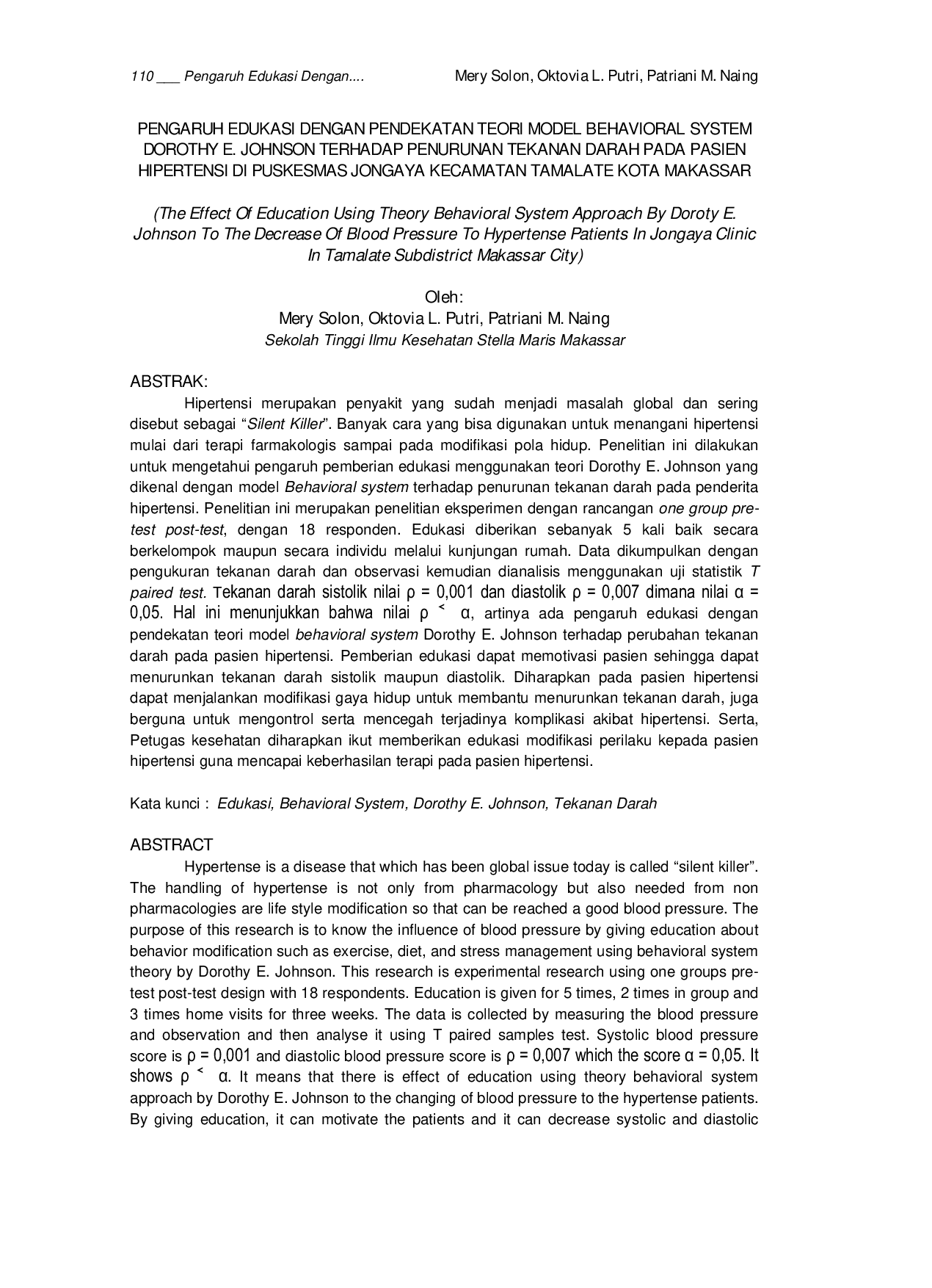 Jurnal MitrasehatJurnal MitrasehatHipertensi merupakan penyakit global yang sering disebut Silent Killer. Penelitian ini bertujuan untuk mengetahui pengaruh pemberian edukasi menggunakan teori Dorothy E. Johnson terhadap penurunan tekanan darah pada penderita hipertensi. Penelitian eksperimen dengan rancangan one group pre-test post-test melibatkan 18 responden. Edukasi diberikan 5 kali melalui kelompok dan kunjungan rumah. Data dikumpulkan dengan pengukuran tekanan darah dan observasi, kemudian dianalisis menggunakan uji statistik T paired test. Hasil menunjukkan nilai ρ < α (0,05) untuk tekanan darah sistolik dan diastolik, yang berarti ada pengaruh edukasi terhadap perubahan tekanan darah. Pemberian edukasi dapat memotivasi pasien untuk menurunkan tekanan darah sistolik dan diastolik, serta mengontrol dan mencegah komplikasi hipertensi. Petugas kesehatan diharapkan memberikan edukasi modifikasi perilaku kepada pasien hipertensi untuk mencapai keberhasilan terapi.