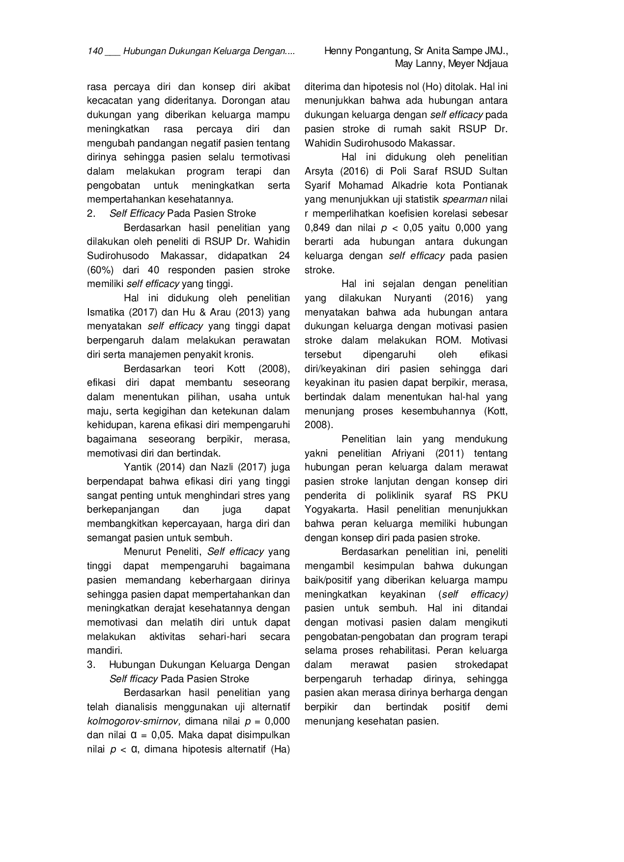 Penelitian selanjutnya dapat menggali lebih dalam mengenai jenis dukungan keluarga yang paling berpengaruh terhadap self-efficacy pasien stroke, misalnya dengan membandingkan efektivitas dukungan emosional, informasional, instrumental, dan penghargaan. Studi kualitatif mendalam bisa dilakukan untuk memahami pengalaman pasien stroke dalam menerima dukungan keluarga dan bagaimana hal itu memengaruhi keyakinan diri mereka dalam pemulihan. Selain itu, penelitian longitudinal dapat meneliti bagaimana perubahan dukungan keluarga dari waktu ke waktu berkorelasi dengan perubahan self-efficacy dan keberhasilan rehabilitasi pasien stroke. Melalui pemahaman yang lebih komprehensif, intervensi yang lebih efektif dapat dirancang untuk meningkatkan self-efficacy pasien stroke melalui optimalisasi dukungan keluarga.