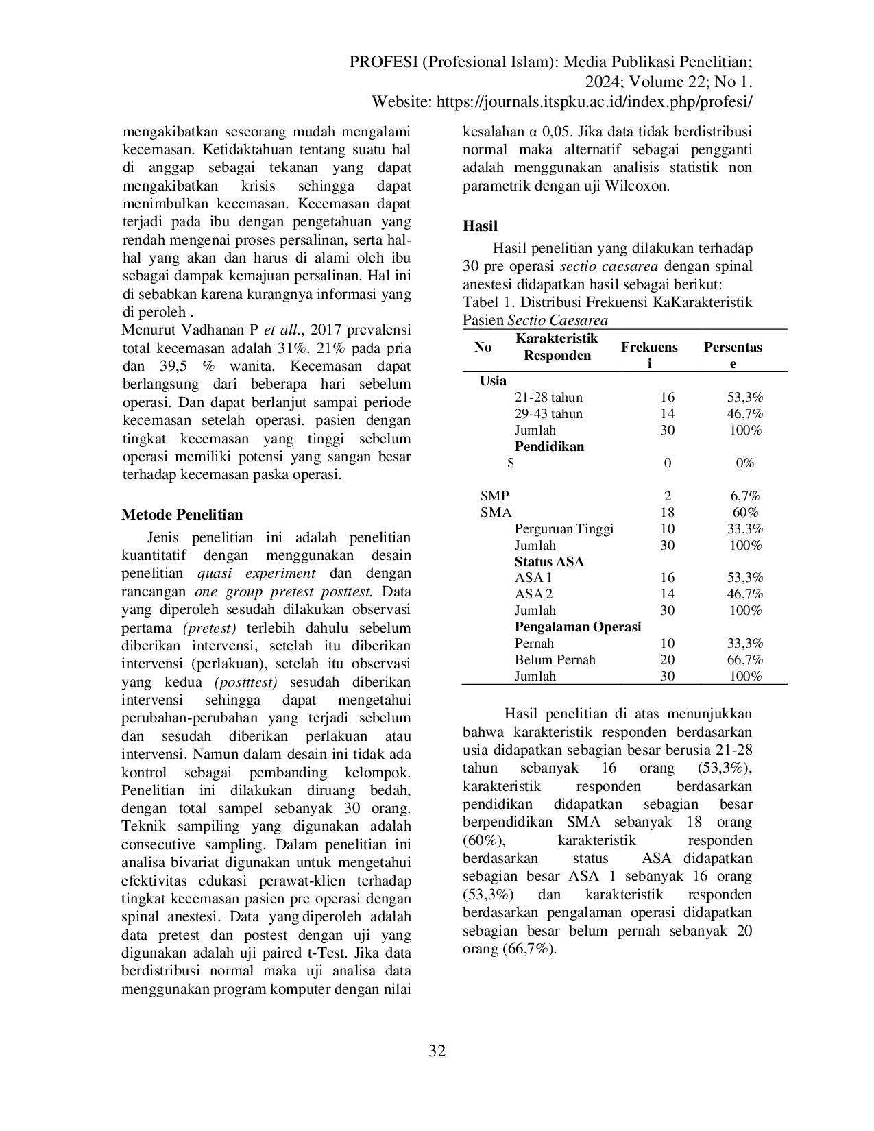 Profesi (Profesional Islam) : Media Publikasi PenelitianProfesi (Profesional Islam) : Media Publikasi PenelitianEdukasi, Kecemasan, pre operasi. Sectio caesarea (SC), merupakan salah satu jenis pembedahan mayor dimana biasanya membawa beberapa derajat risiko bagi pasien yang menjalaninya. Risiko tinggi pembedahan ini menimbulkan dampak atau pengaruh psikologis pada pasien pre operasi, dan pengaruh psikologis terhadap tindakan pembedahan yaitu timbul rasa ketakutan dan kecemasan. Banyak faktor yang mempengaruhi kecemasan dalam mengahadapi persalinan Sectio Caesarea diantaranya tingkat pengetahuan, pendidikan, dukungan suami, ekonomi dan psikologi. Tujuan penelitian ini adalah mengetahui adakah efektivitas edukasi terhadap tingkat kecemasan pada pasien pre operasi sectio caesarea dengan spinal anestesi. Metode penelitian ini adalah menggunakan metode kuantitatif dengan desain quasi experiment dan dengan rancangan one group pretest posttest, yaitu dengan melakukan observasi pertama (pretest) terlebih dahulu sebelum diberikan intervensi, setelah itu diberikan intervensi (perlakuan), setelah itu observasi yang kedua (postttest) sesudah menggunakan pengukuran skala APAIS. Teknik pengambilan data menggunakan non probability sampling dengan consecutive sampling, berjumlah 30 responden. Analisa menggunakan uji statistik Wilcoxon. Hasil penelitian berdasarkan analisis hasil uji statistik menggunakan Wilcoxon diketahui pada derajat kepercayaan 95% (α=0,05) diperoleh nilai p value = 0,000 (p<0,05) yang berarti Ha diterima dan Ho ditolak sehingga dapat disimpulkan bahwa terdapat efektivitas edukasi terhadap tingkat kecemasan pada pasien pre operasi sectio caesarea dengan spinal anestesi.