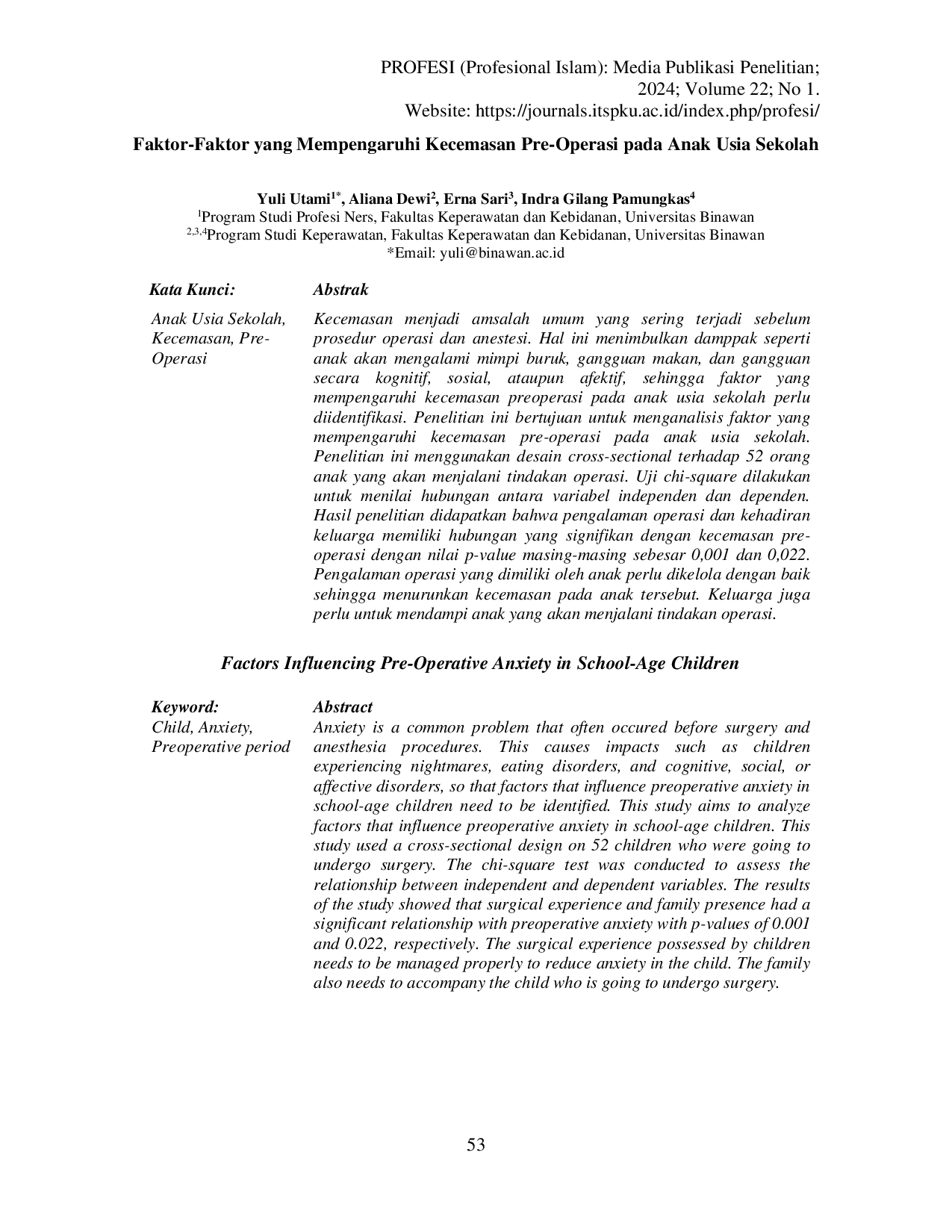 Profesi (Profesional Islam) : Media Publikasi PenelitianProfesi (Profesional Islam) : Media Publikasi PenelitianKecemasan adalah masalah umum yang sering terjadi sebelum prosedur operasi dan anestesi. Hal ini menimbulkan dampak seperti anak akan mengalami mimpi buruk, gangguan makan, dan gangguan secara kognitif, sosial, ataupun afektif, sehingga faktor yang mempengaruhi kecemasan preoperasi pada anak usia sekolah perlu diidentifikasi. Penelitian ini bertujuan untuk menganalisis faktor yang mempengaruhi kecemasan pre-operasi pada anak usia sekolah. Penelitian ini menggunakan desain cross-sectional terhadap 52 orang anak yang akan menjalani tindakan operasi. Uji chi-square dilakukan untuk menilai hubungan antara variabel independen dan dependen. Hasil penelitian didapatkan bahwa pengalaman operasi dan kehadiran keluarga memiliki hubungan yang signifikan dengan kecemasan pre-operasi dengan nilai p-value masing-masing sebesar 0,001 dan 0,022. Pengalaman operasi yang dimiliki oleh anak perlu dikelola dengan baik sehingga menurunkan kecemasan pada anak tersebut. Keluarga juga perlu untuk mendampi anak yang akan menjalani tindakan operasi.