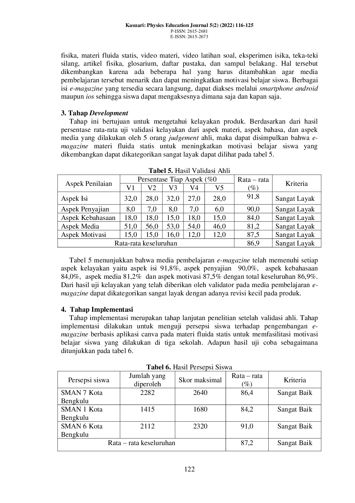 Berdasarkan hasil uji kelayakan dari aspek isi, penyajian, kebahasaan, media, dan motivasi, media pembelajaran e-magazine berbasis aplikasi Canva pada materi fluida statis dinilai sangat layak dengan persentase rata-rata 87,2%.Persepsi siswa terhadap e-magazine juga sangat positif dengan rata-rata persentase 87,22%.Dengan demikian, e-magazine ini sangat efektif untuk meningkatkan motivasi belajar siswa.